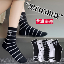 袜子女新款中筒袜可爱米奇卡通图案日系长筒袜运动黑白条纹袜潮袜