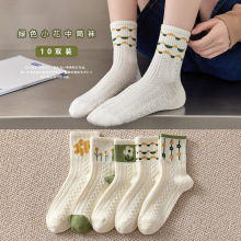 白色袜子女中筒袜ins潮防滑少年学院风绿色花朵少女长袜春夏百搭