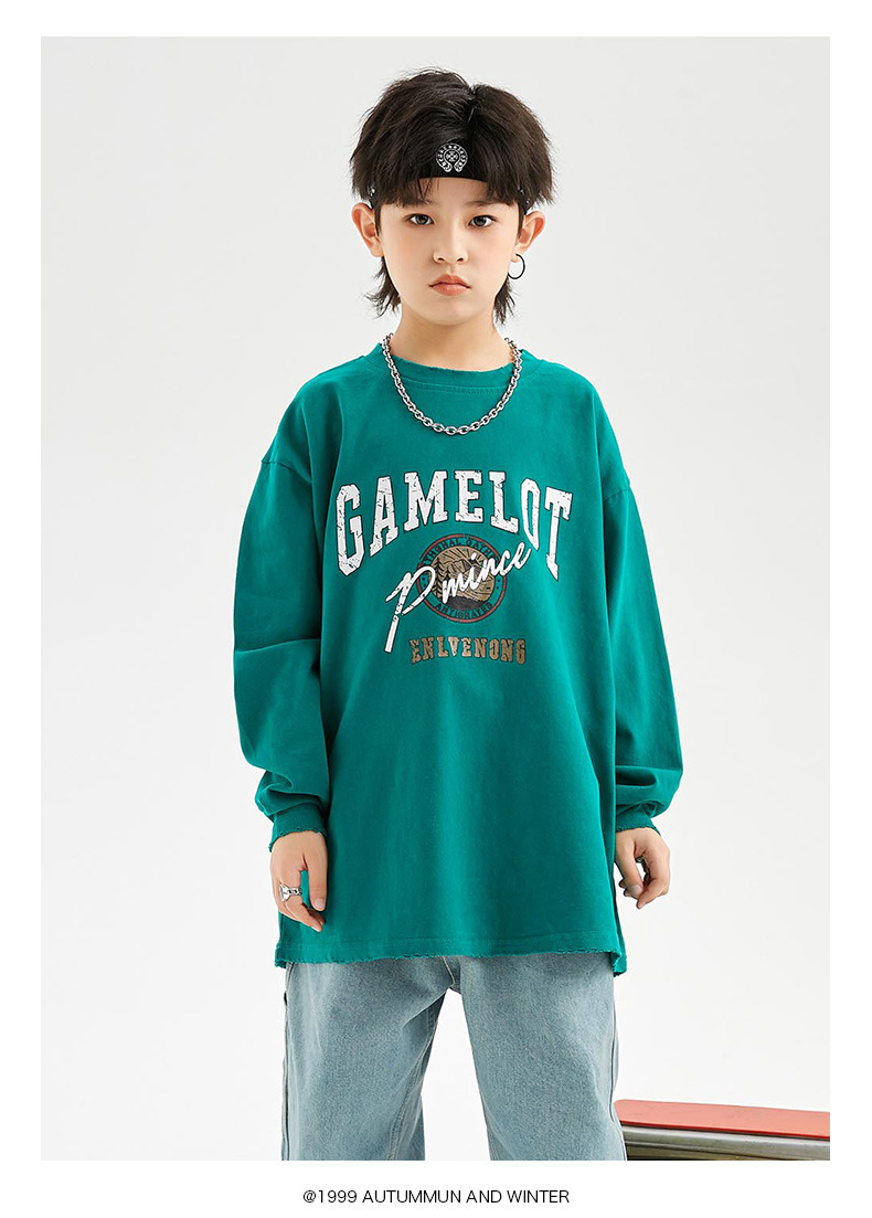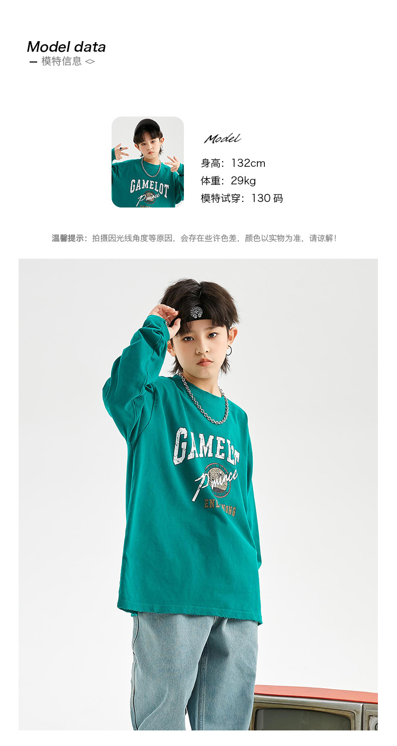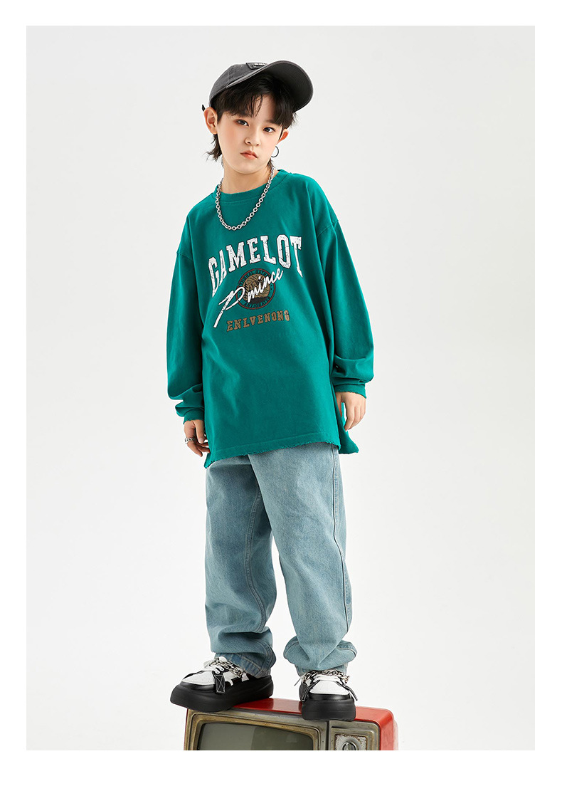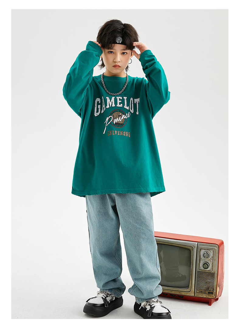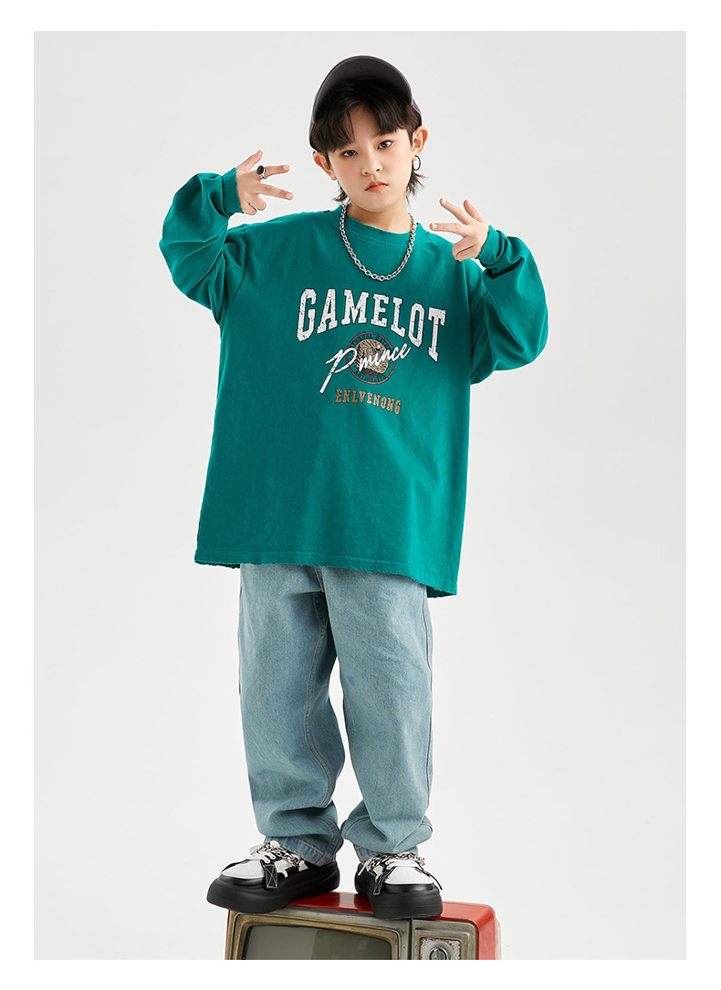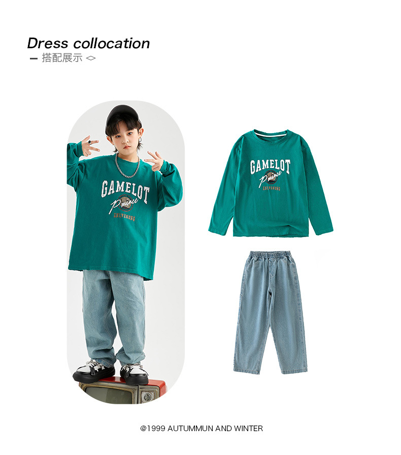 힙합 스트리트 댄스 패션 브랜드 아동복 남성과 여성을위한 느슨한 다크 그린 긴팔 스웨터 어린이 세트 어린이 댄스 공연 의상스토어 가기