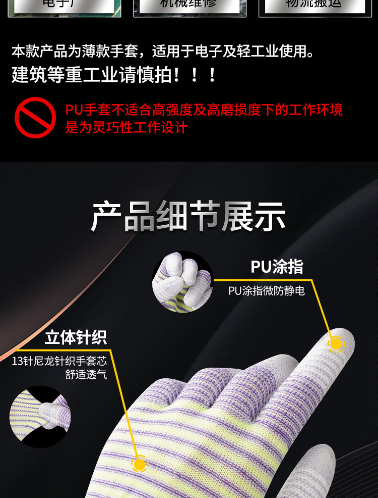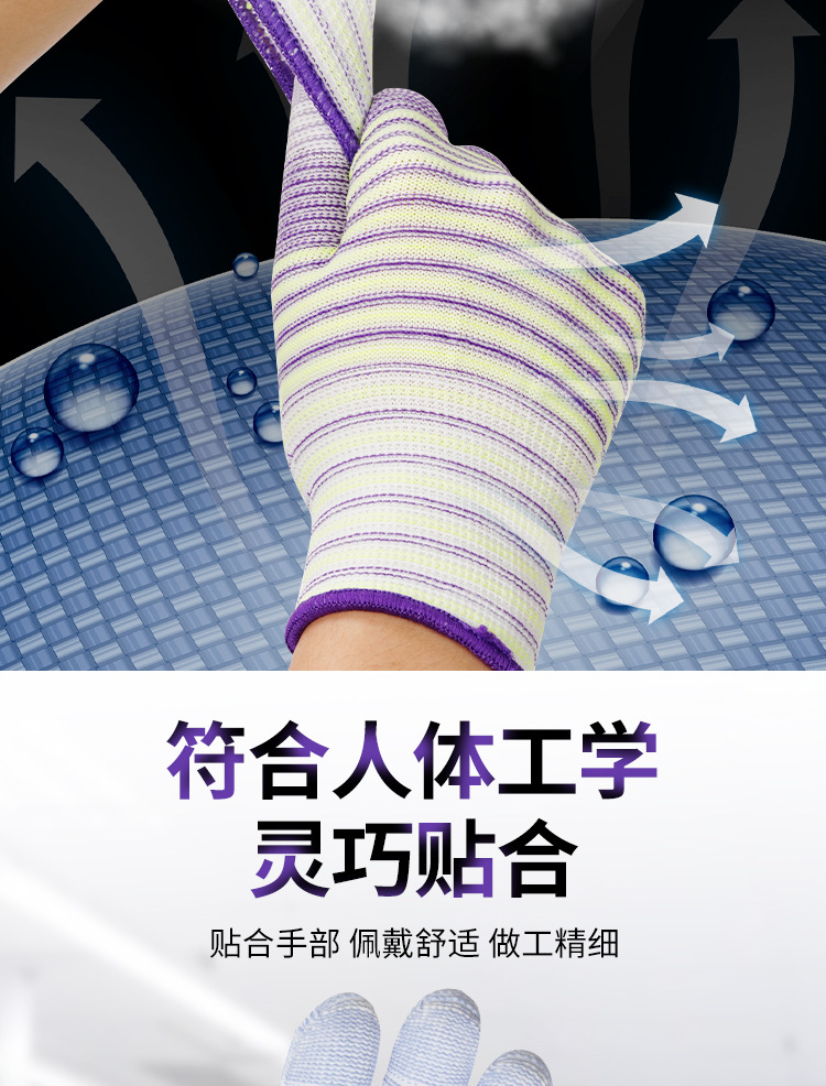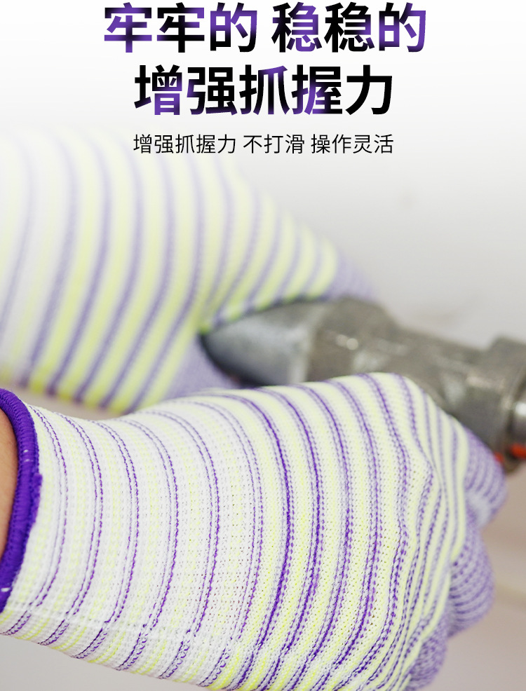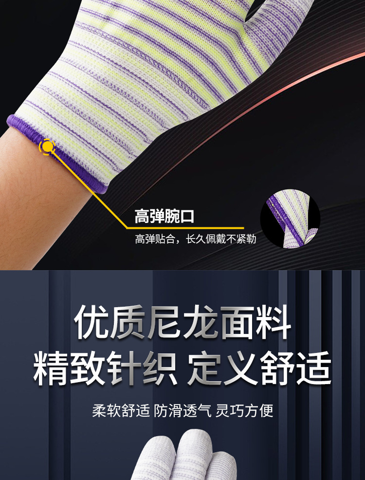 접착 얇은 내마모성 전자 공장 작업 내구성 노동 보호 장갑 도매 미끄럼 방지 장갑 PU 손가락 코팅 얼룩말 패턴