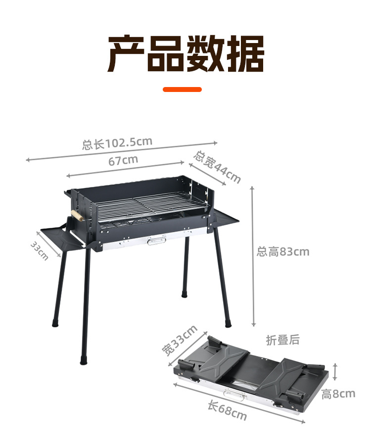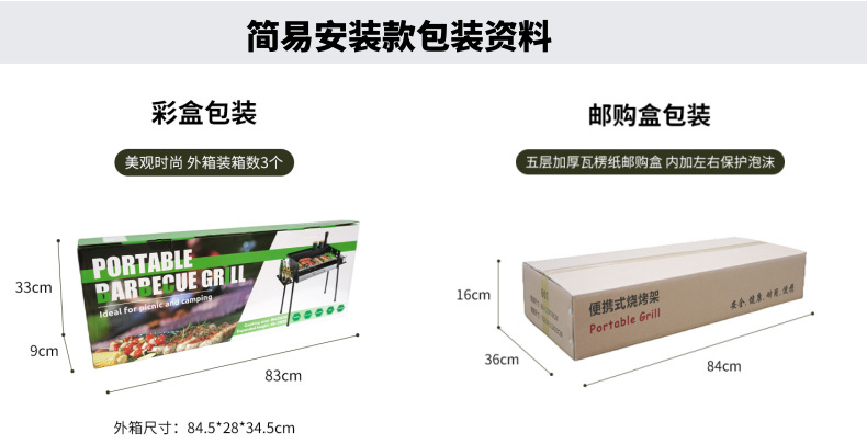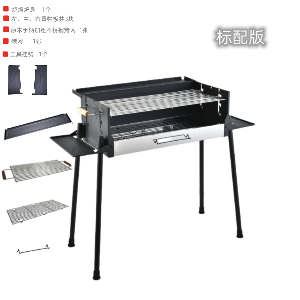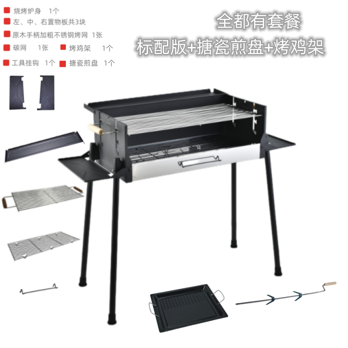 • 접이식 표준 모델에는 모두 럭셔리 패키지 바베큐 그릴(표준 버전 + 에나멜 프라이팬 + 치킨 그릴) 스테인레스 스틸 온라인 통신 판매 상자가 함께 제공됩니다.