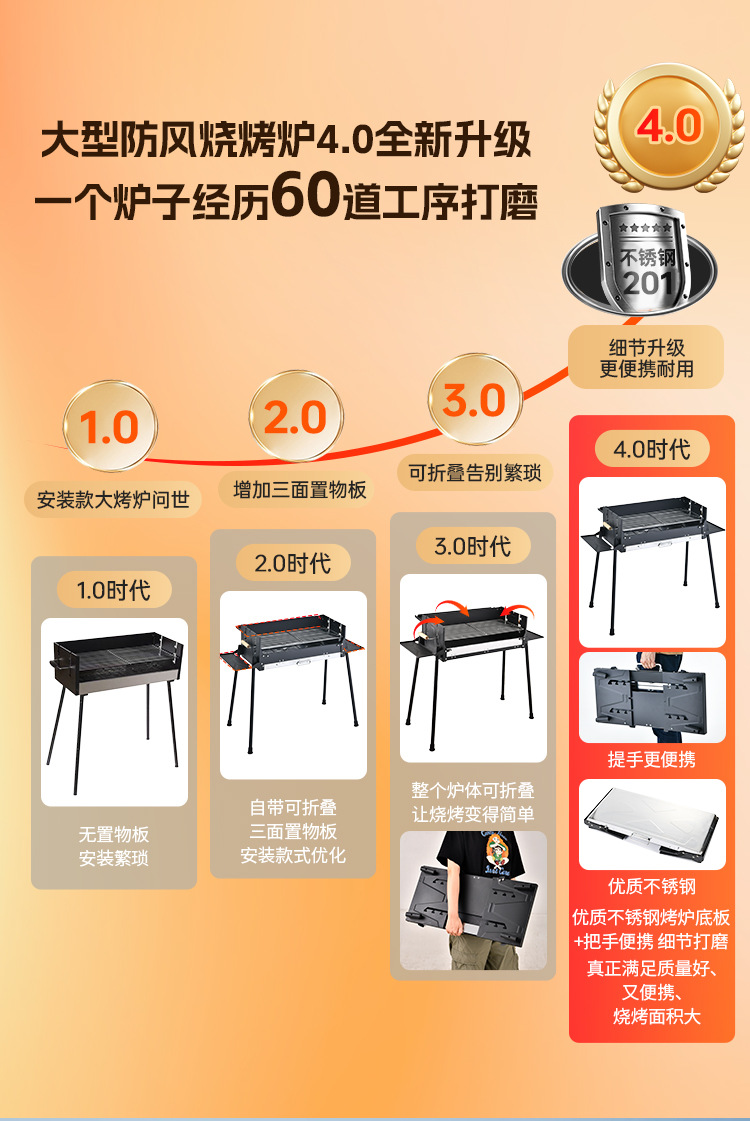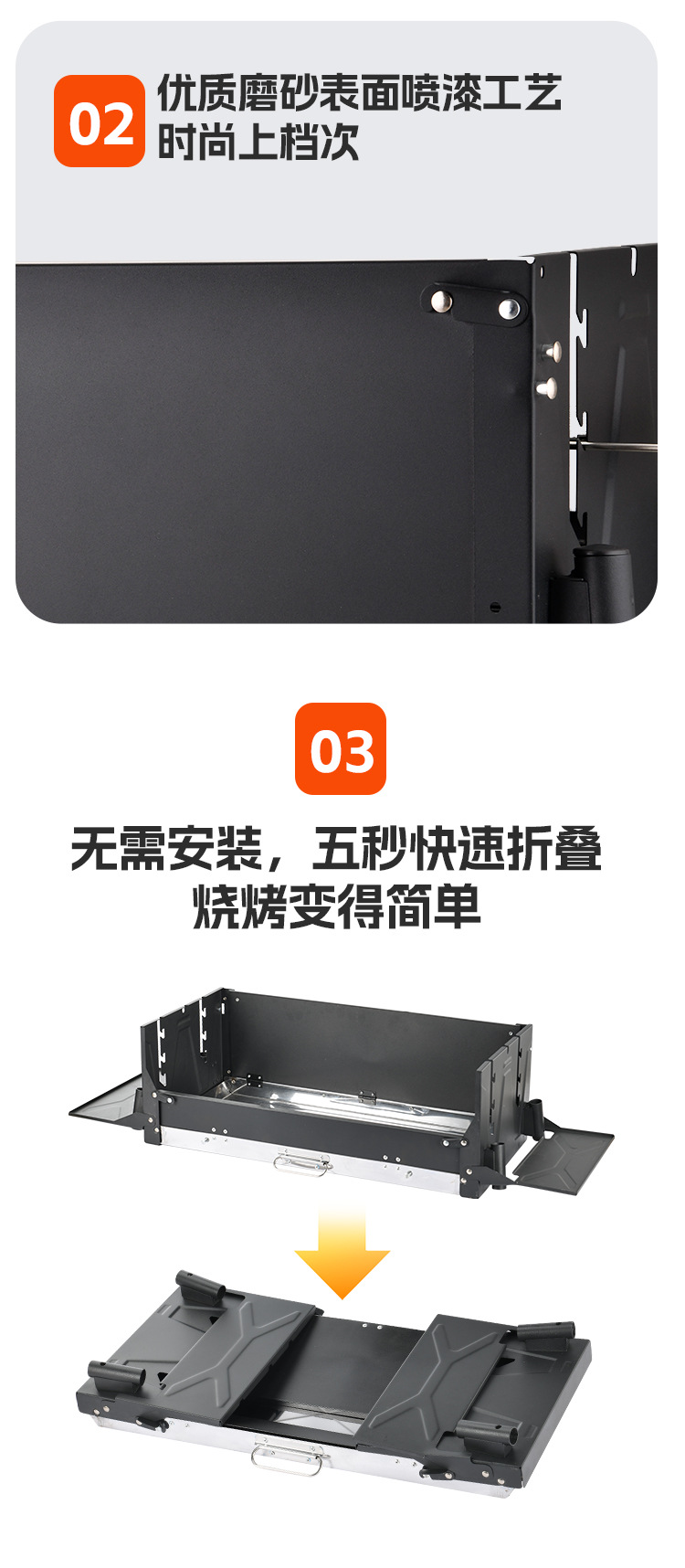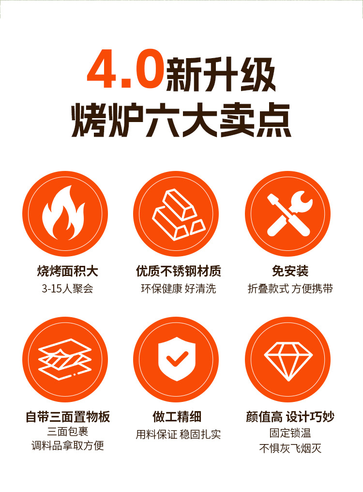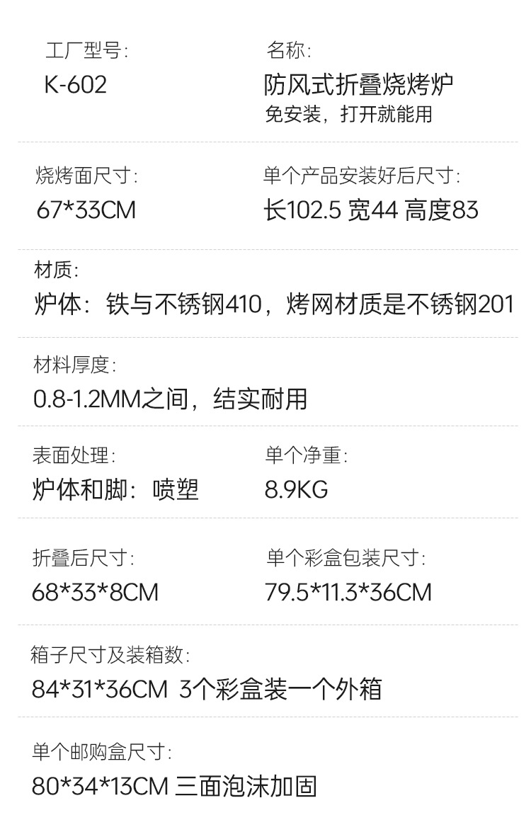 • 접이식 표준 모델에는 모두 럭셔리 패키지 바베큐 그릴(표준 버전 + 에나멜 프라이팬 + 치킨 그릴) 스테인레스 스틸 온라인 통신 판매 상자가 함께 제공됩니다.