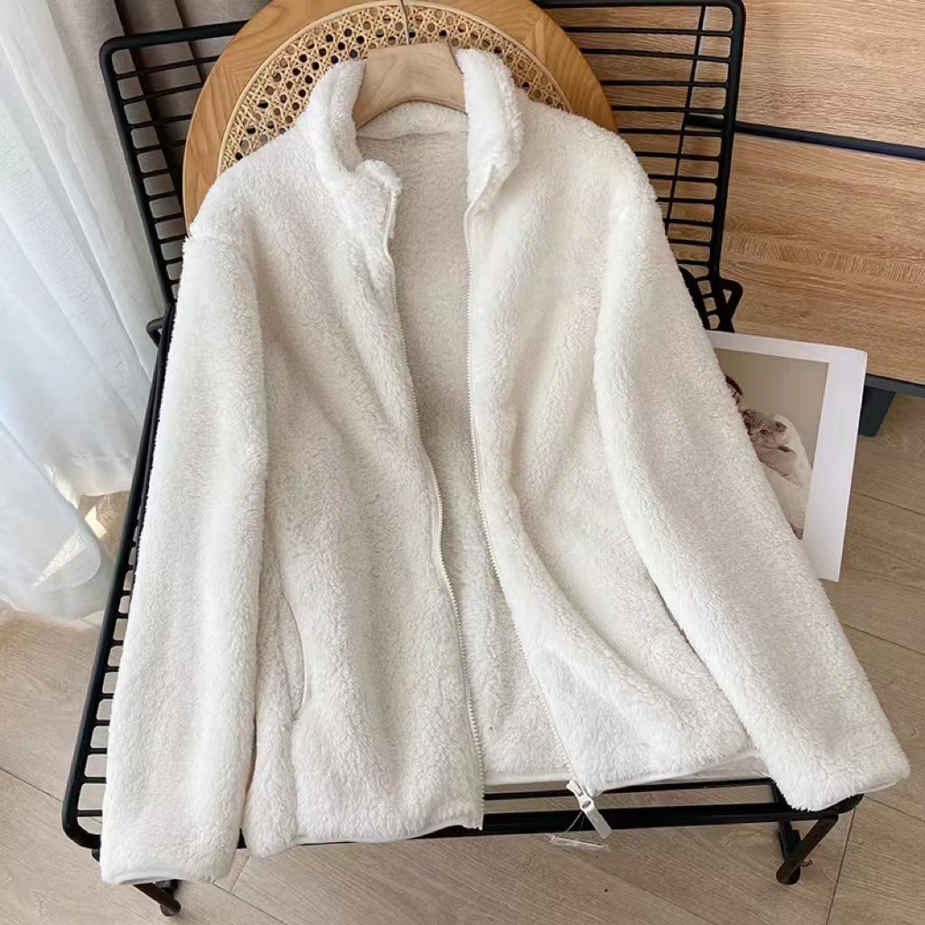 가을 겨울 커플용 남녀 공용 긴 기모 폴라 플리스 스탠드 칼라 지퍼 재킷 만화 패치 자수 코트 숏 스타일스토어 가기