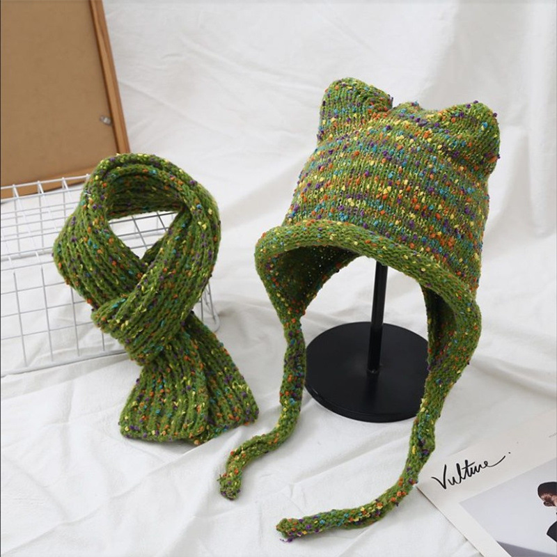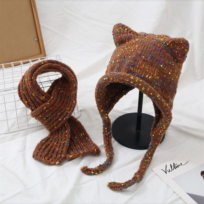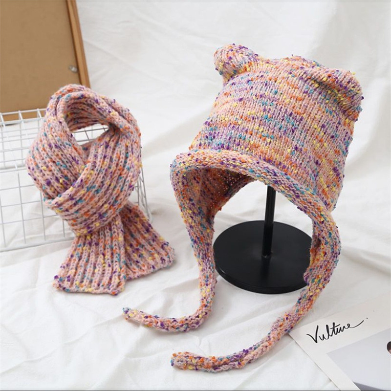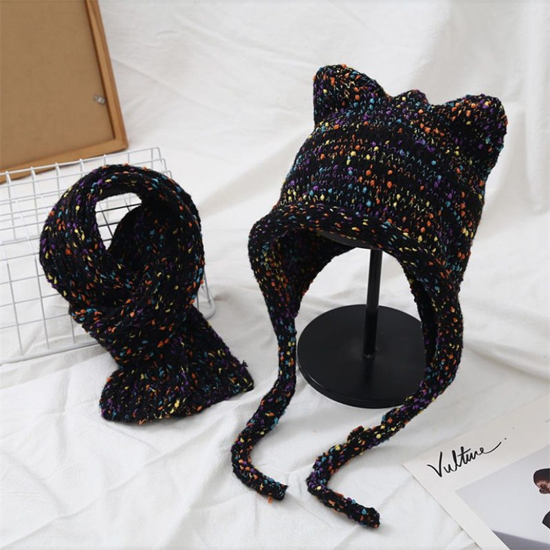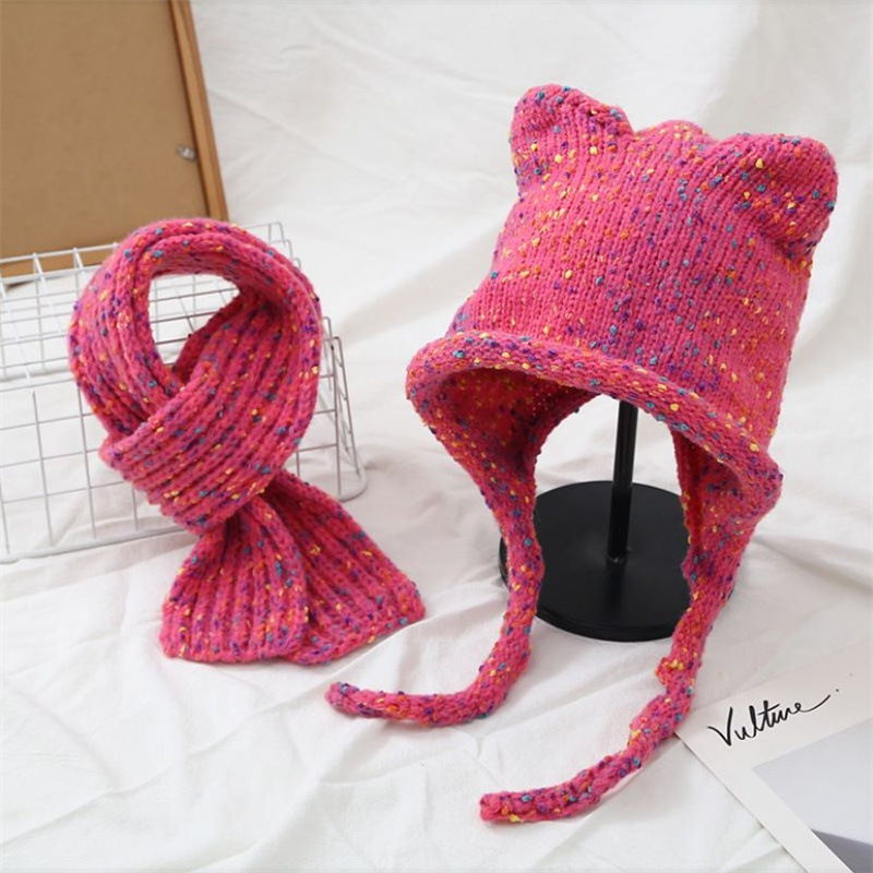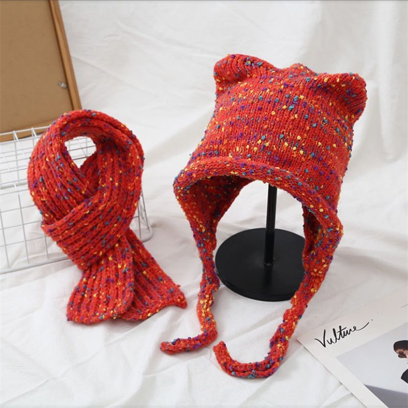 달콤한 귀여운 새끼 고양이 귀 양모 모자 레이스 업 컬러 니트 모자 여성의 일본 가을과 겨울 귀 따뜻한 모자