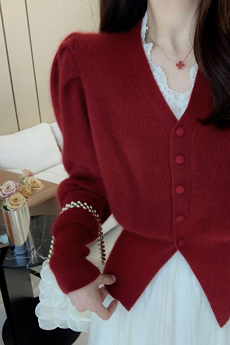 레드 니트 가디건 여성용 쇼트 2022 가을 겨울 새로운 V넥 긴팔 올매치 우아한 슬림핏 베이스 셔츠