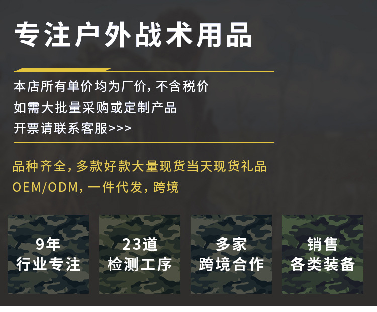 军迷户外用品、箱包行业创业者供应大量现货。 接受来样加工生产,贴牌定做等服务。 招商加盟优势 1,品牌问题、我们的产品没有任何品牌标示、您可自定义品牌。 2,本厂货源稳定、完全自主经营生产,只做好品质产品。 3,15天退换货服务,无理由退换货,邮费自理,完整售后服务。 4,提供一件代发,如有特殊要求,请给旺旺留言,店家会按要求发货。 5,当天发货,每天下午6点之前的订单,一般当天发出。