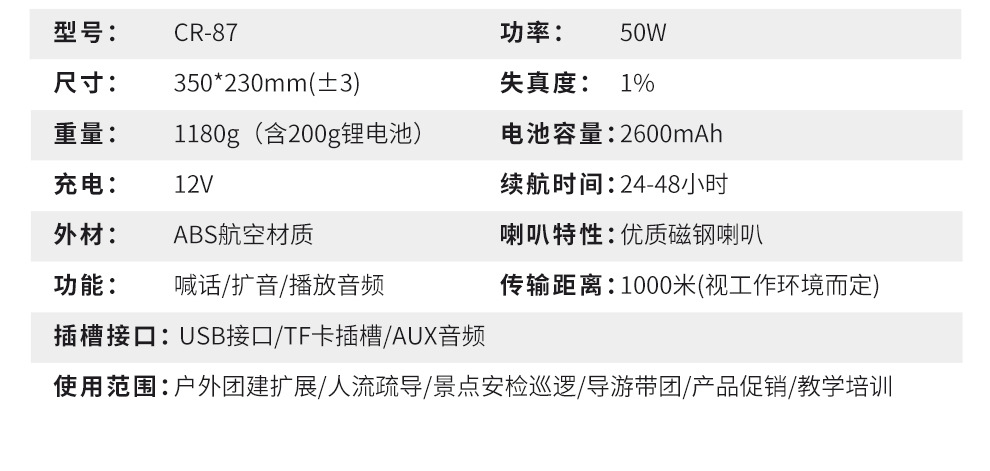 Thunder King CR-87 고출력 메가폰 다기능 블루투스 휴대용 메가폰 프로모션 순찰 야외 스피커
