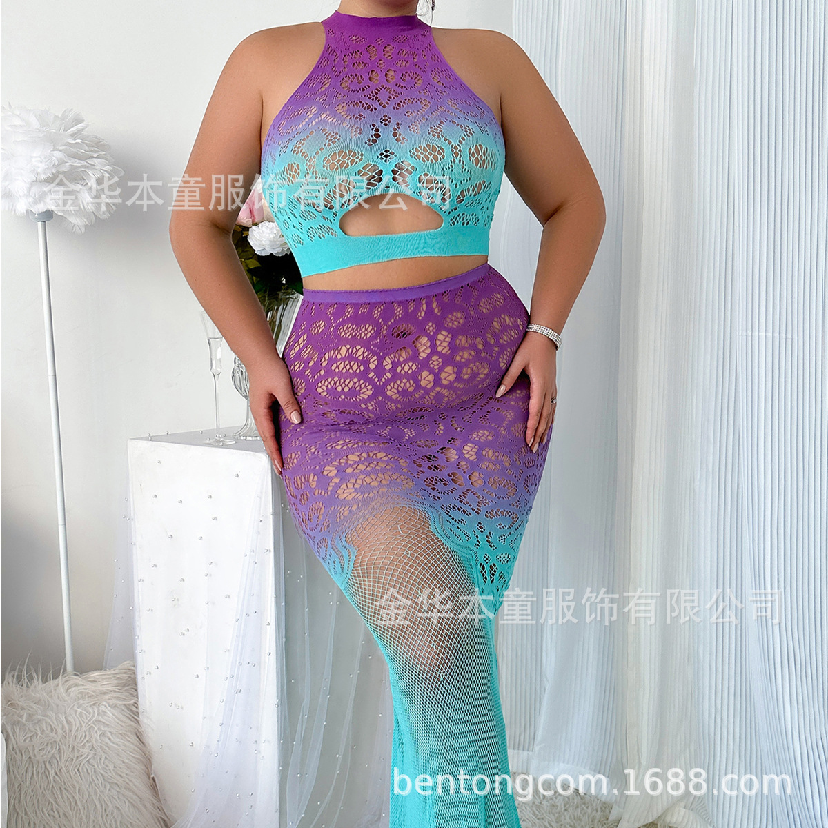 유럽과 미국에서 인기 있는 롱 드레스 그라데이션 컬러 레이스 슈트 드레스 보라색에서 파란색으로 변하는 플러스 사이즈 빅사이즈 여성용 SH008