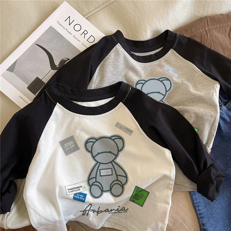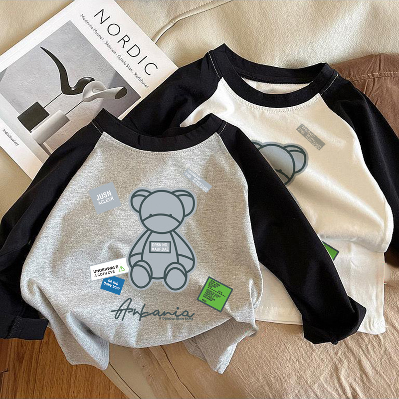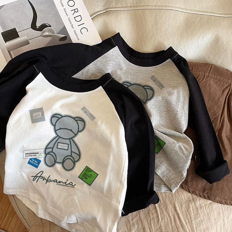 면 어린이 티셔츠 긴팔 남성 및 여성 아동복 2024 만화 귀여운 작은 곰 어린이 탑베이스 셔츠 봄과 가을스토어 가기
