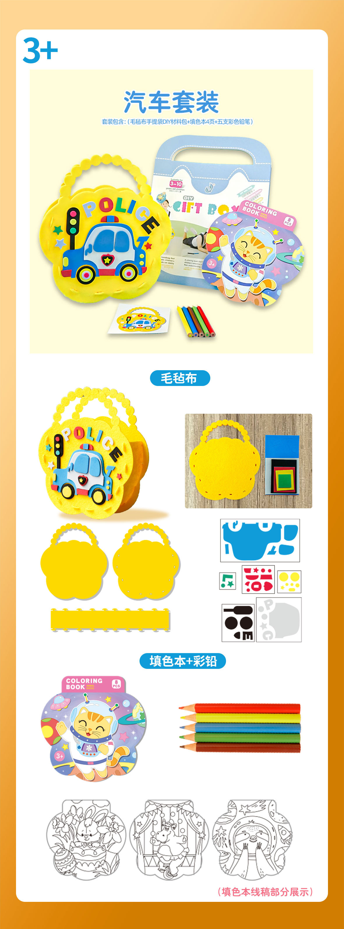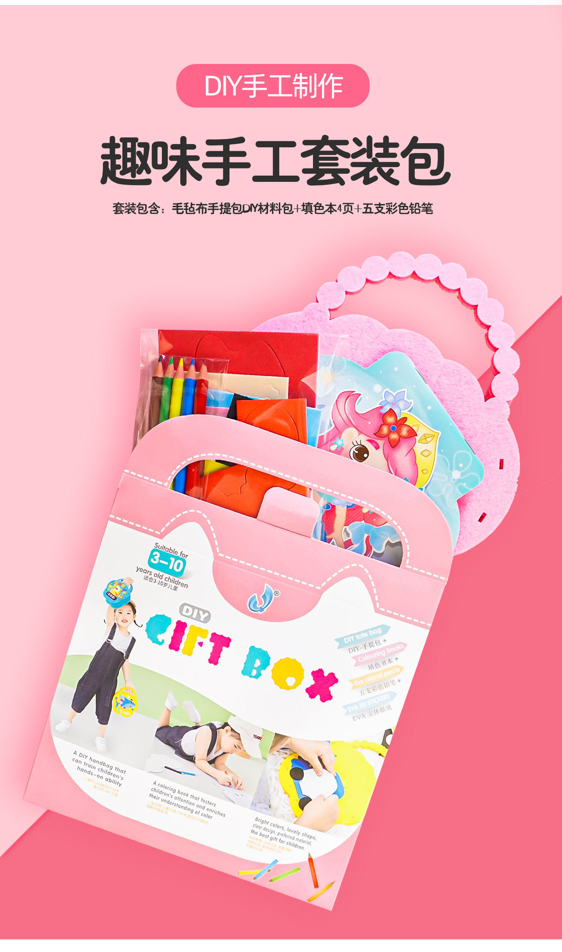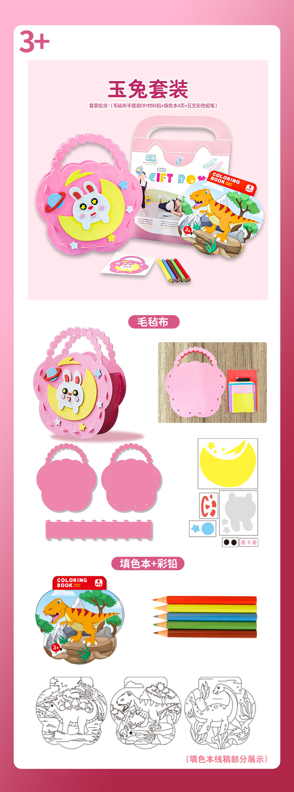 • 세트 포함 (펠트 천 핸드백 + EVA 스티커 소재 가방 + 색칠하기 책 4 페이지 + 5 색연필)