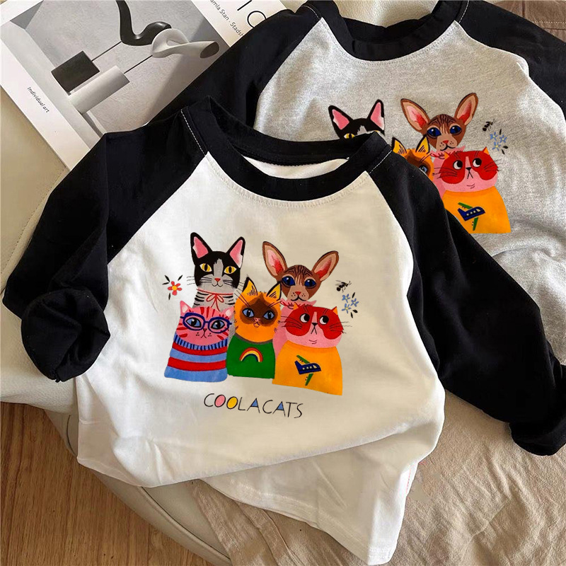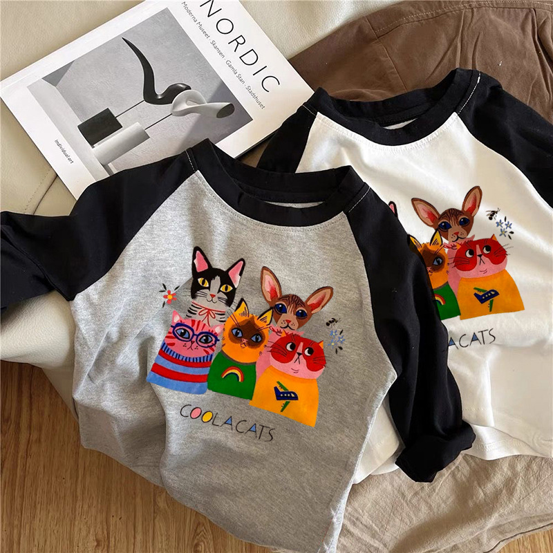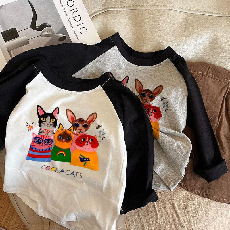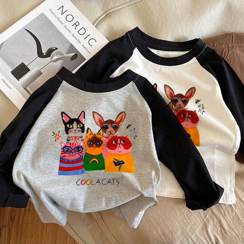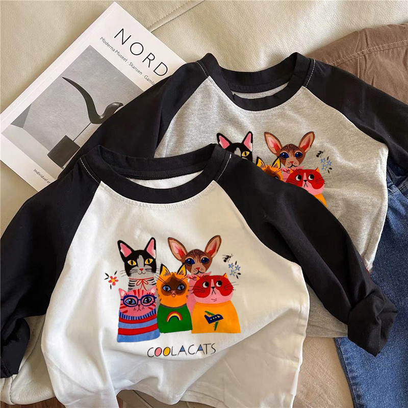 면 어린이 티셔츠 긴 소매 남녀 아동복 2024 귀여운 만화 새끼 고양이 어린이 탑베이스 셔츠 봄과 가을