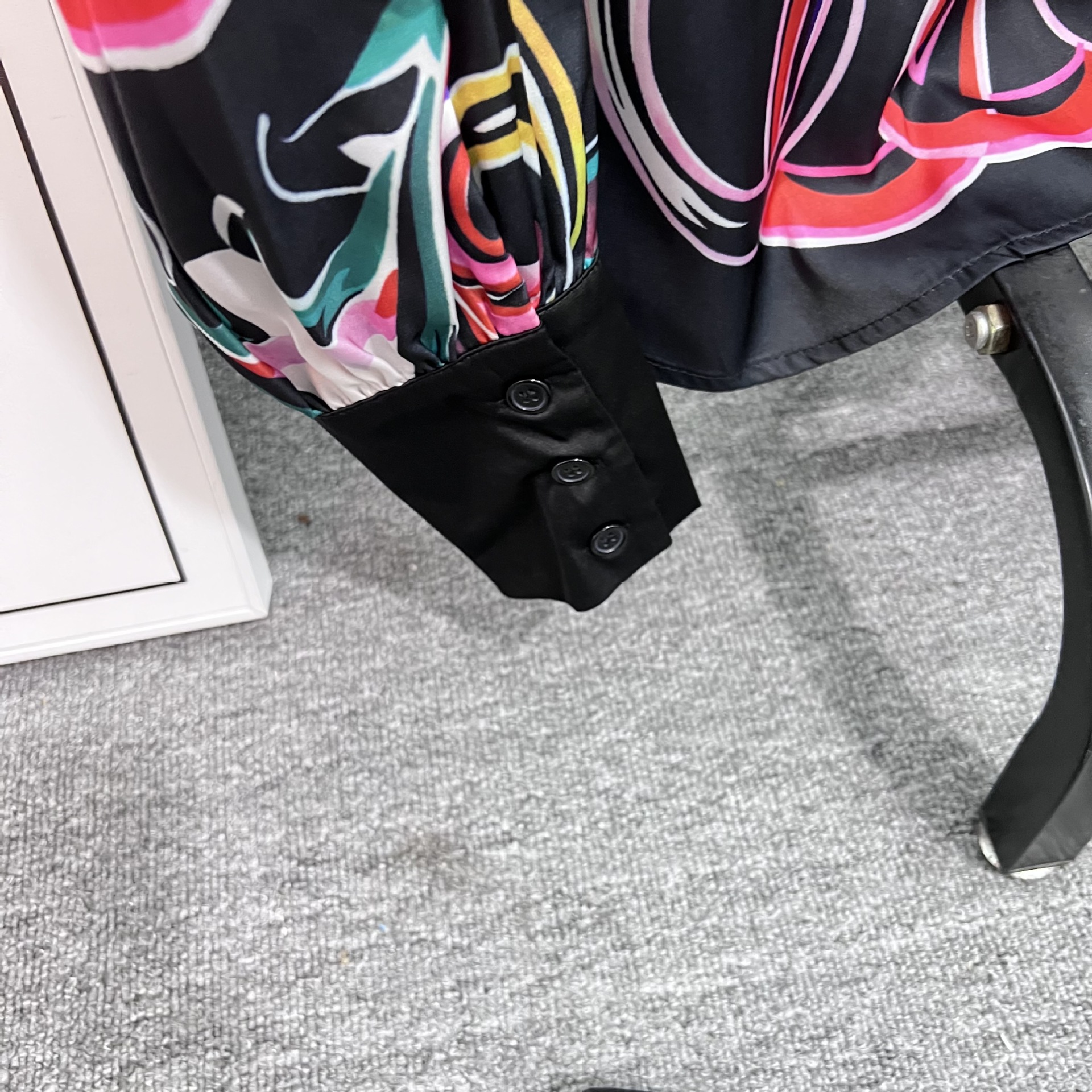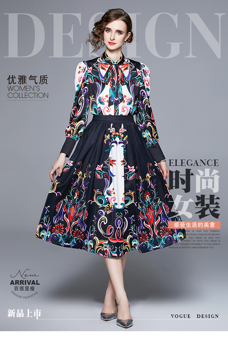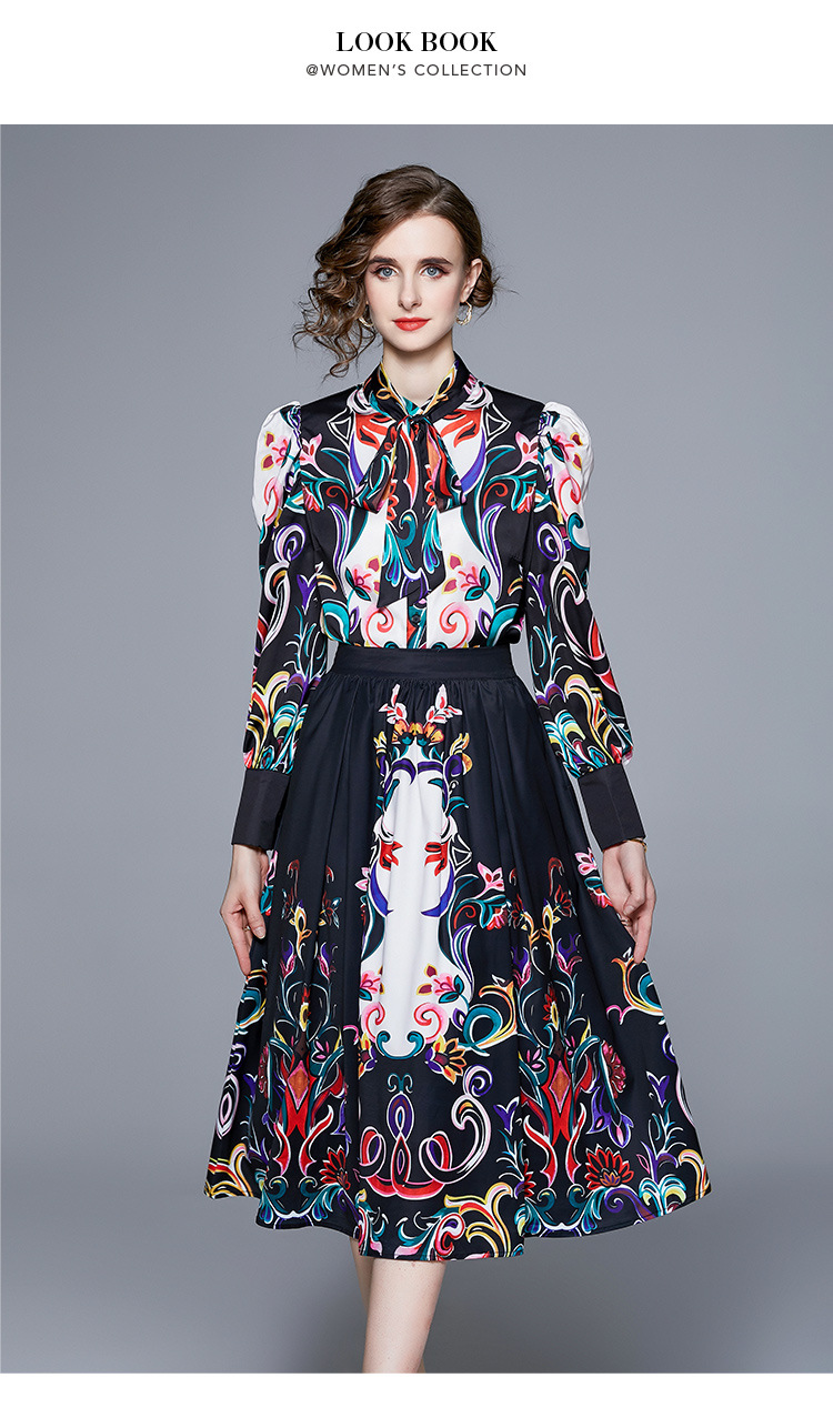우유 새틴 포지셔닝 인쇄 긴 소매 셔츠 꽉 허리 A-라인 대형 스윙 스커트 봄 새로운 여성의 우아한 세트