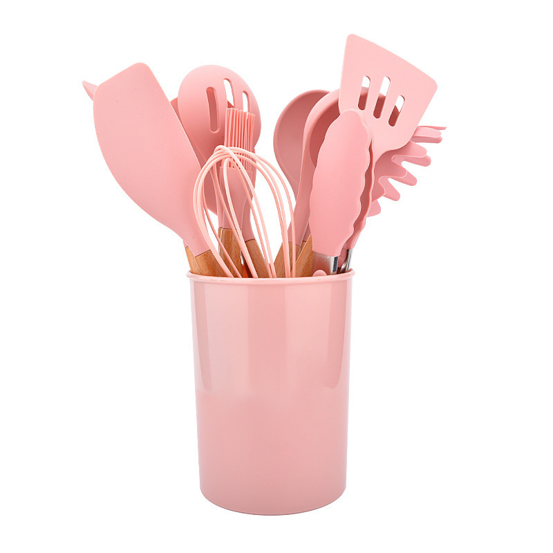 다채로운 나무 손잡이 실리콘 주방 용품 11 조각 세트 요리 냄비 삽 스푼 오일 브러시 저장 배럴 도구 주방 용품 세트 도매