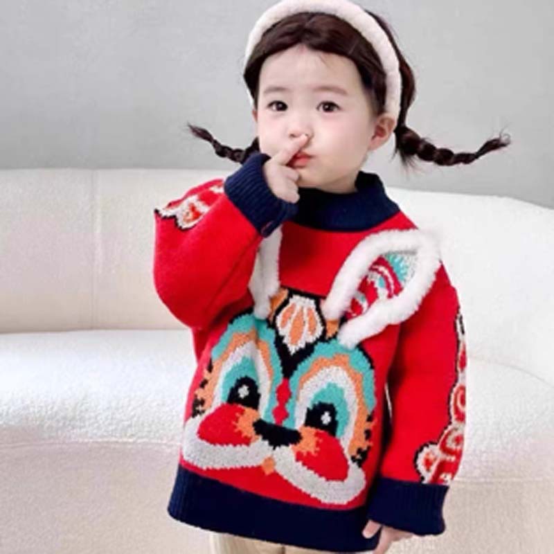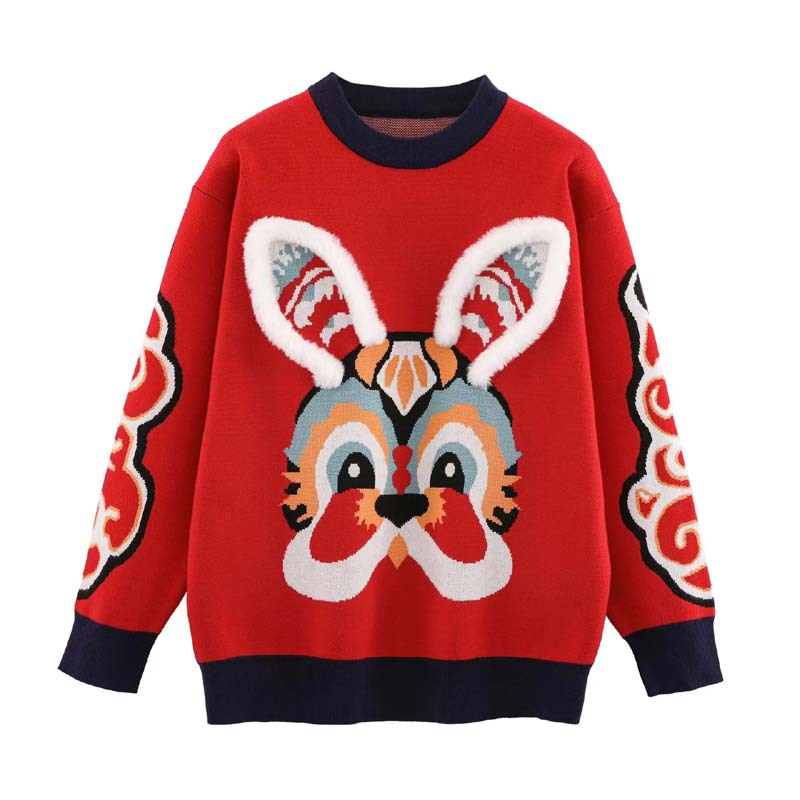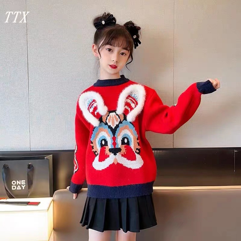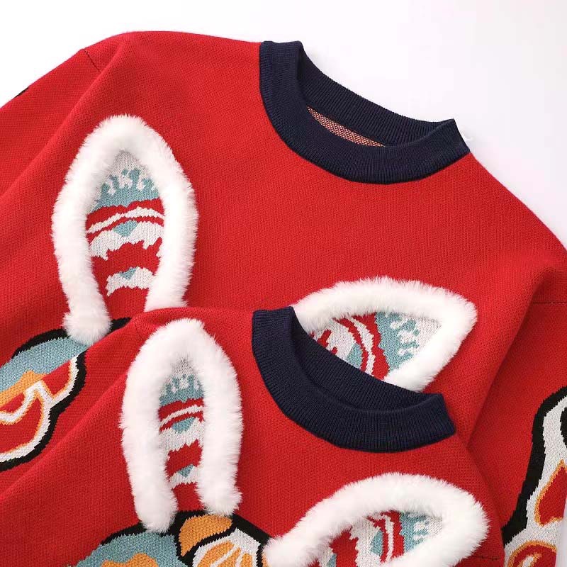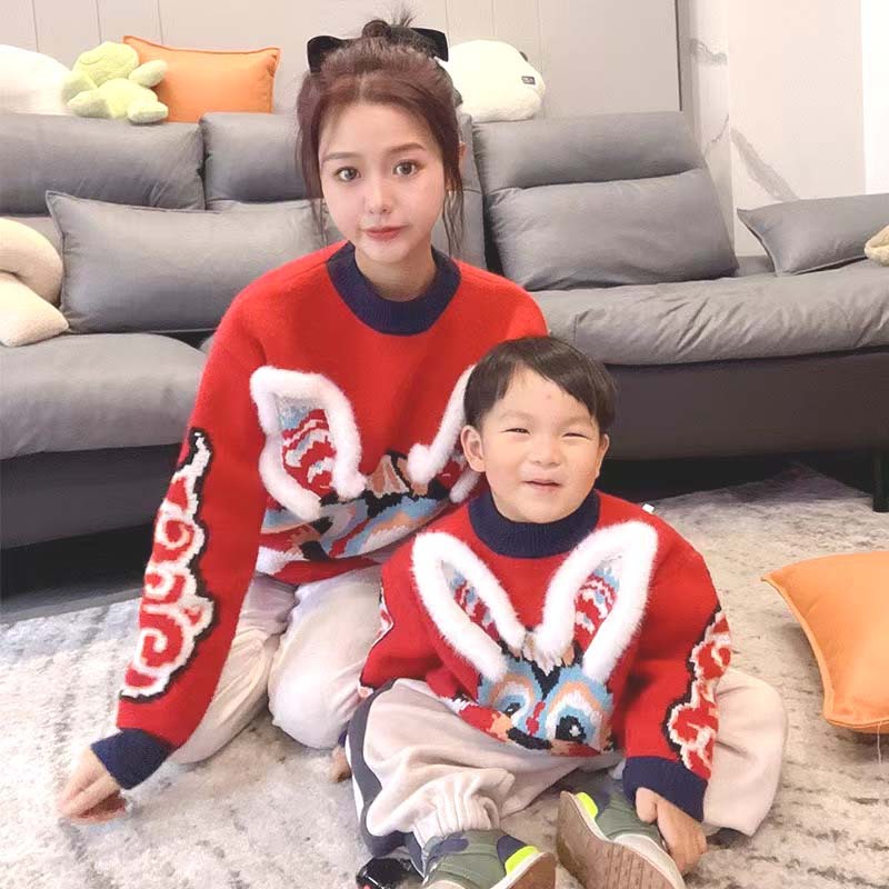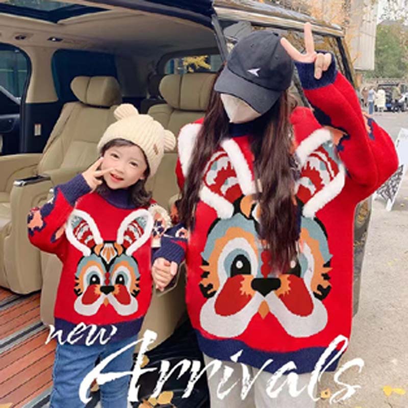 새로운 부모-자녀 어머니-딸 의류 토끼 귀 자카드 패밀리 매칭 의상 두꺼운 만화 라운드 넥 긴 소매 빨간색 스웨터