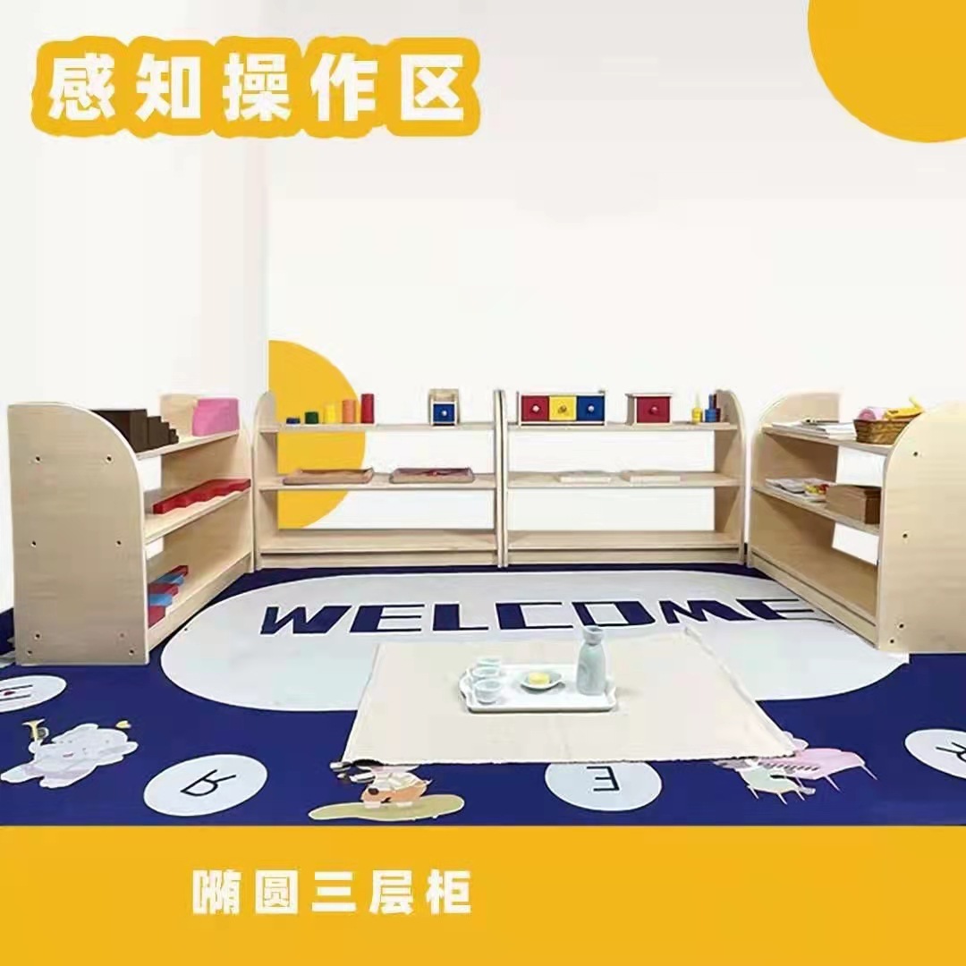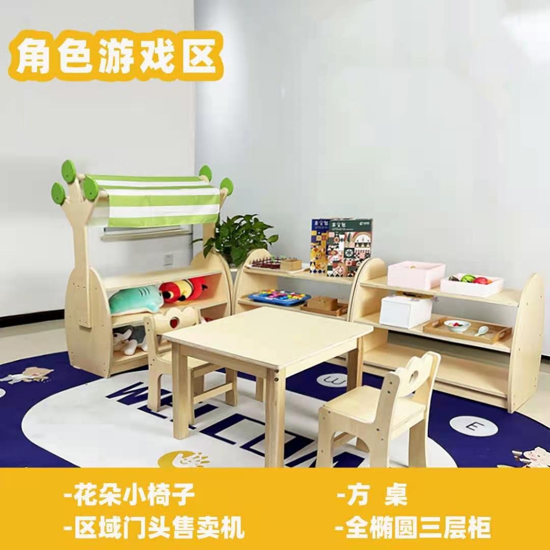 유치원 교육 센터 조기 교육 교실 레이아웃 구역 캐비닛 몬테소리 교육 보관소 캐비닛 장난감 보관 랙 단단한 나무 테이블 및 의자스토어 가기