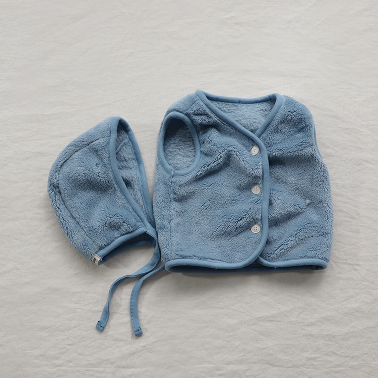 2024 가을 아기 조끼, 가을용 오픈형 단추 달린 플러시 조끼, 유아용 단색 조끼, 모자 포함