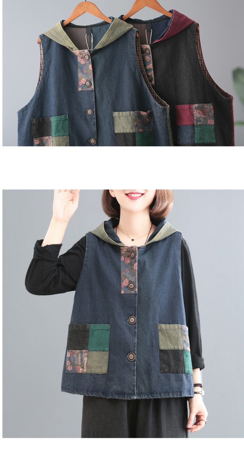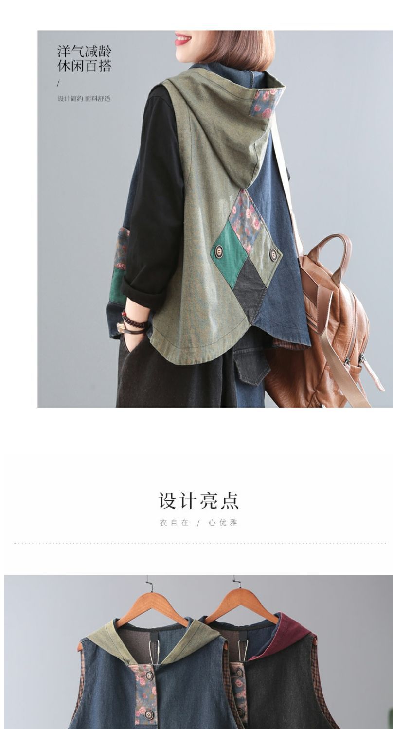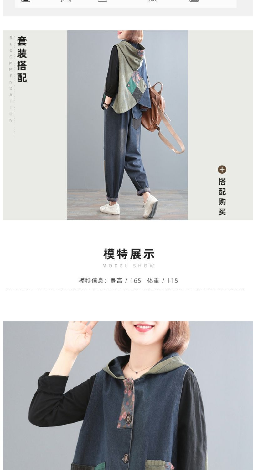 봄과 가을 새로운 한국 스타일 플러스 사이즈 고기 커버 빈티지 고민 후드 프린트 스티칭 데님 조끼스토어 가기