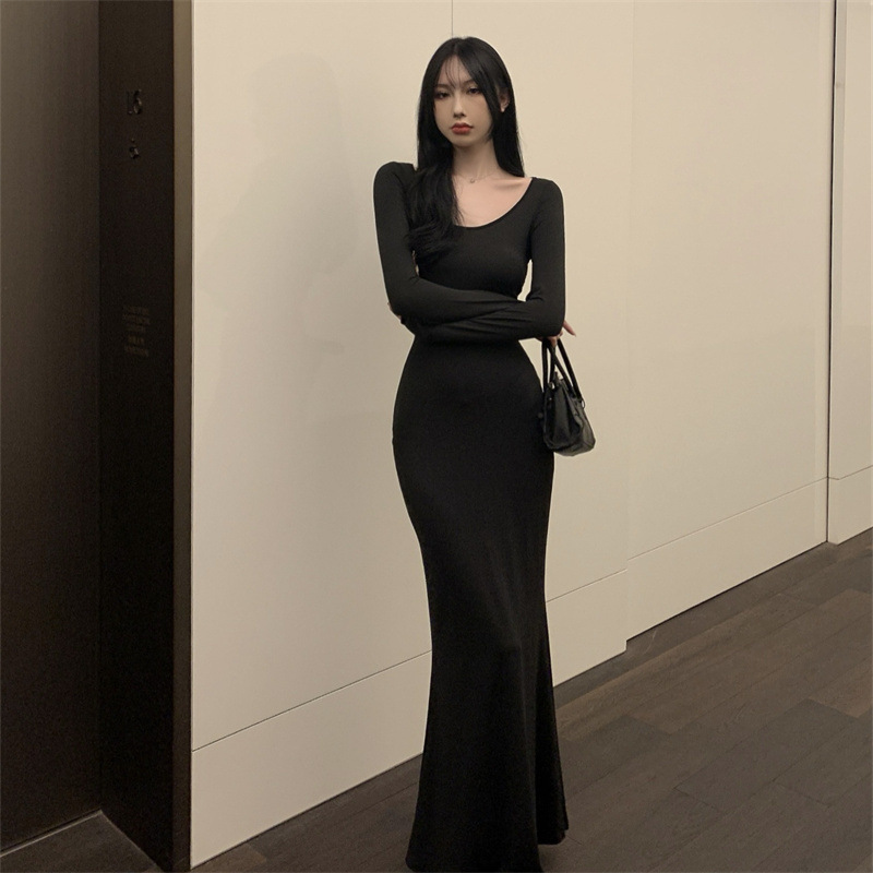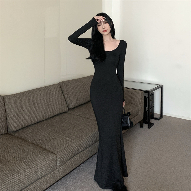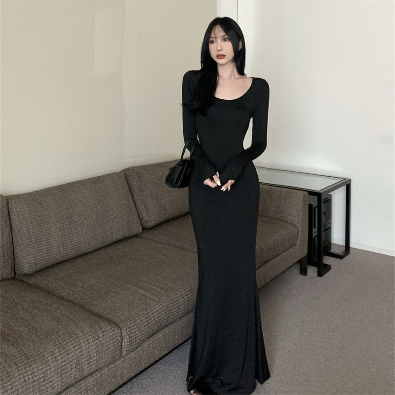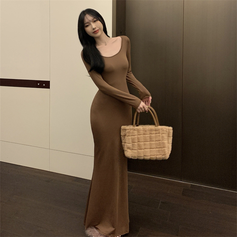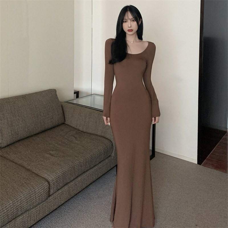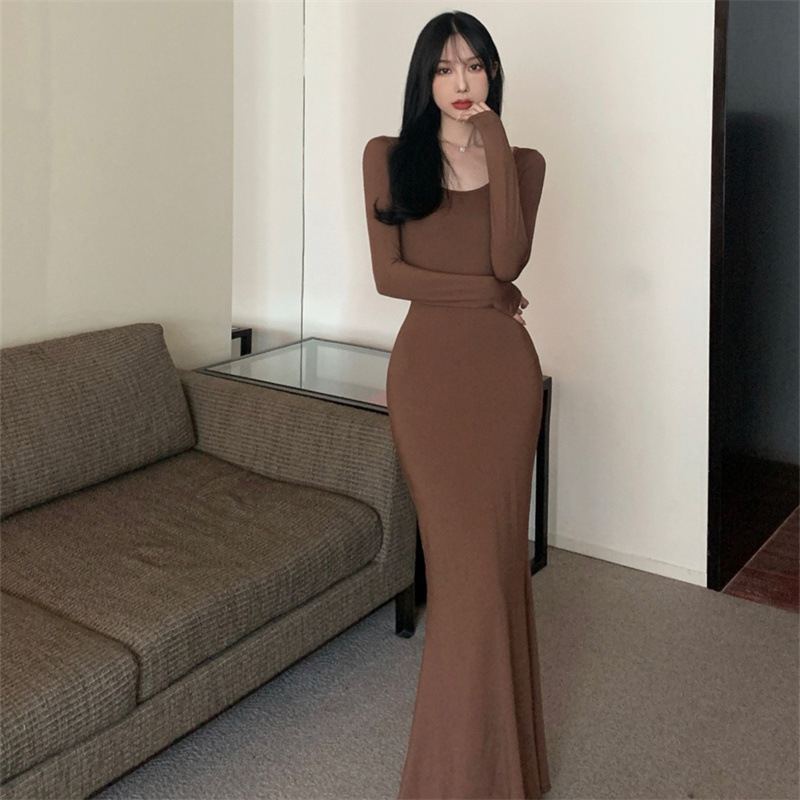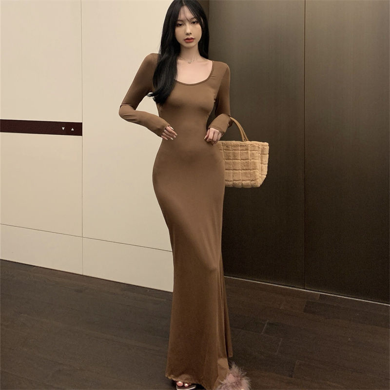 2024 새로운 가을 스타일 핫 소녀 스타일 긴팔 드레스 여성 커피 컬러 바닥 긴 드레스 슬림 피쉬 테일 솔리드 컬러 스커트