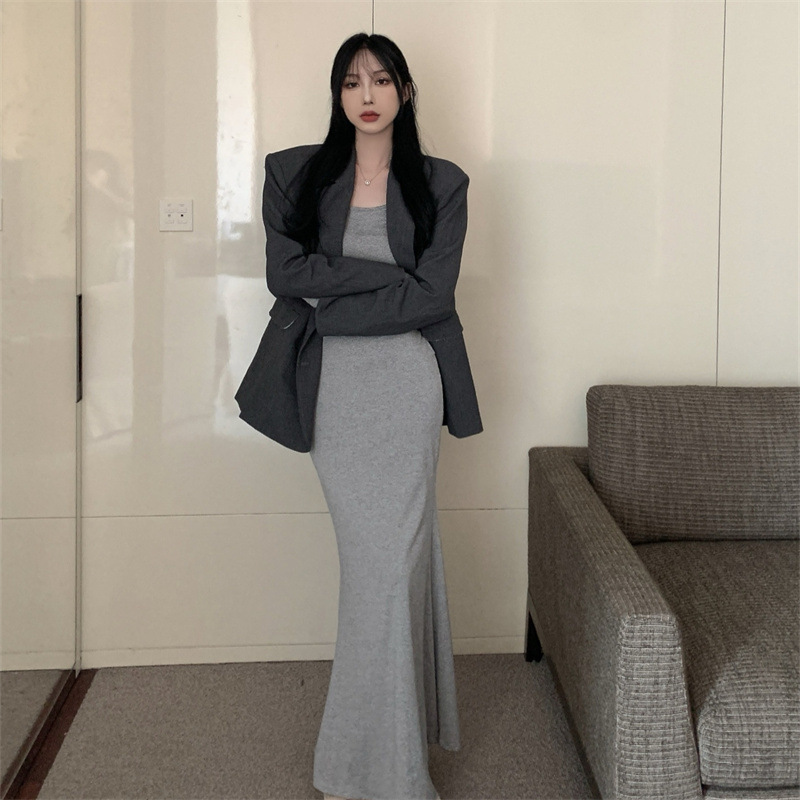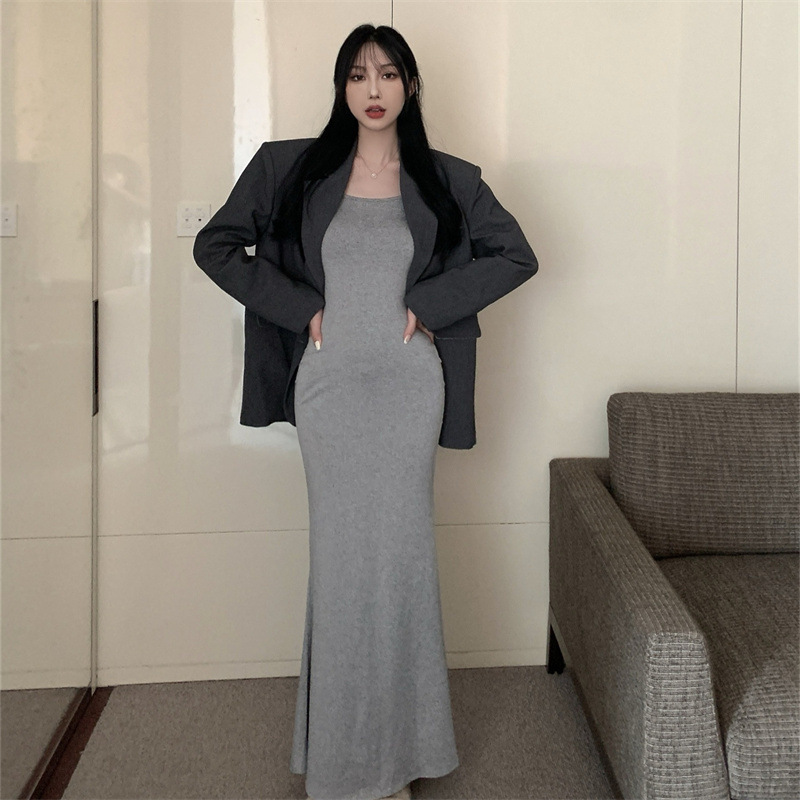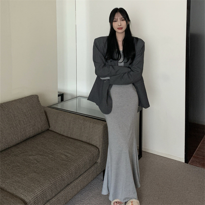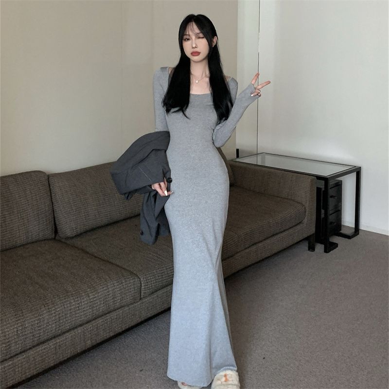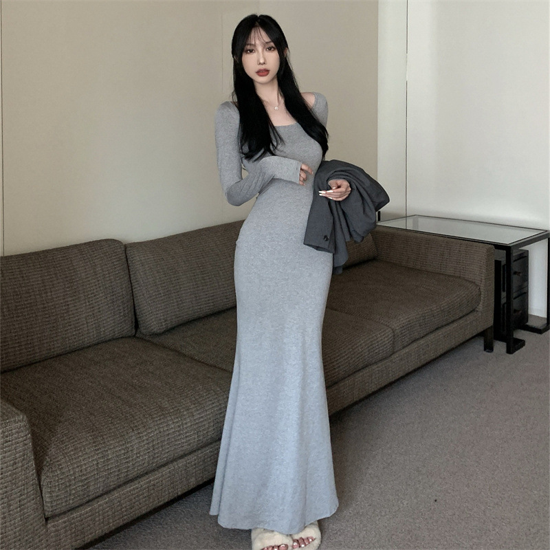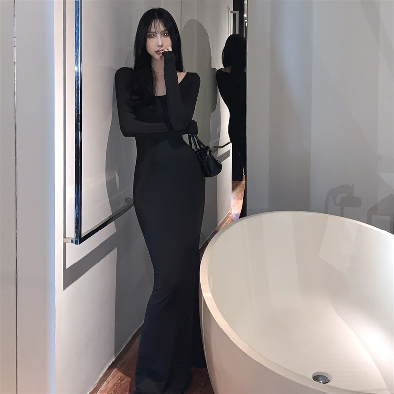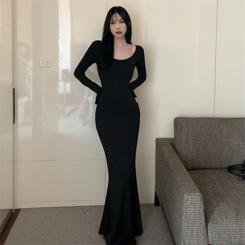 2024 새로운 가을 스타일 핫 소녀 스타일 긴팔 드레스 여성 커피 컬러 바닥 긴 드레스 슬림 피쉬 테일 솔리드 컬러 스커트