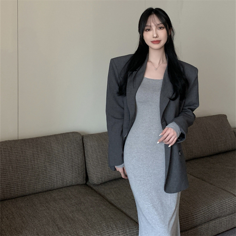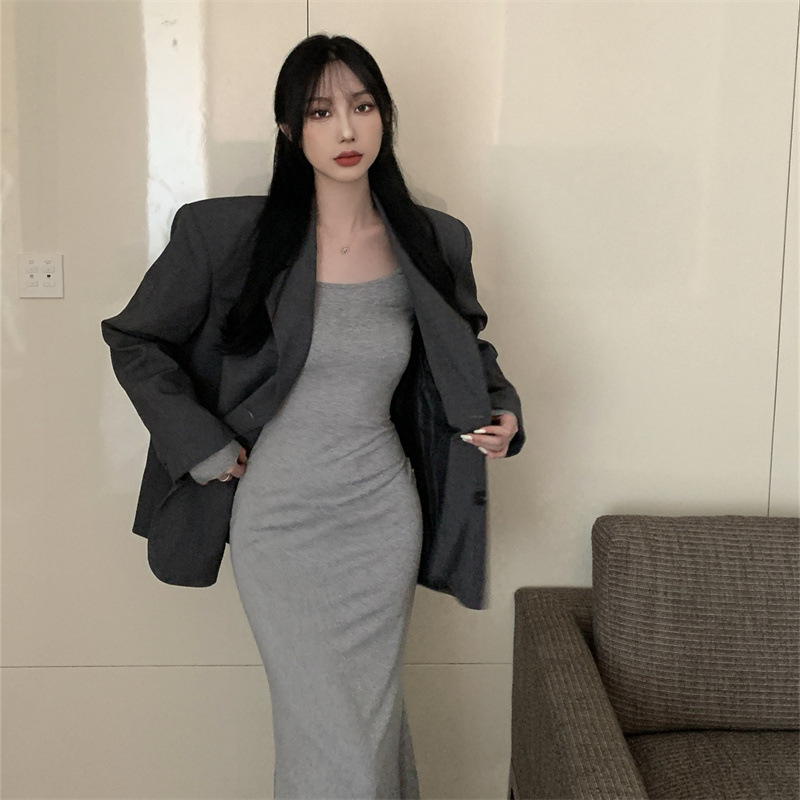 2024 새로운 가을 스타일 핫 소녀 스타일 긴팔 드레스 여성 커피 컬러 바닥 긴 드레스 슬림 피쉬 테일 솔리드 컬러 스커트스토어 가기