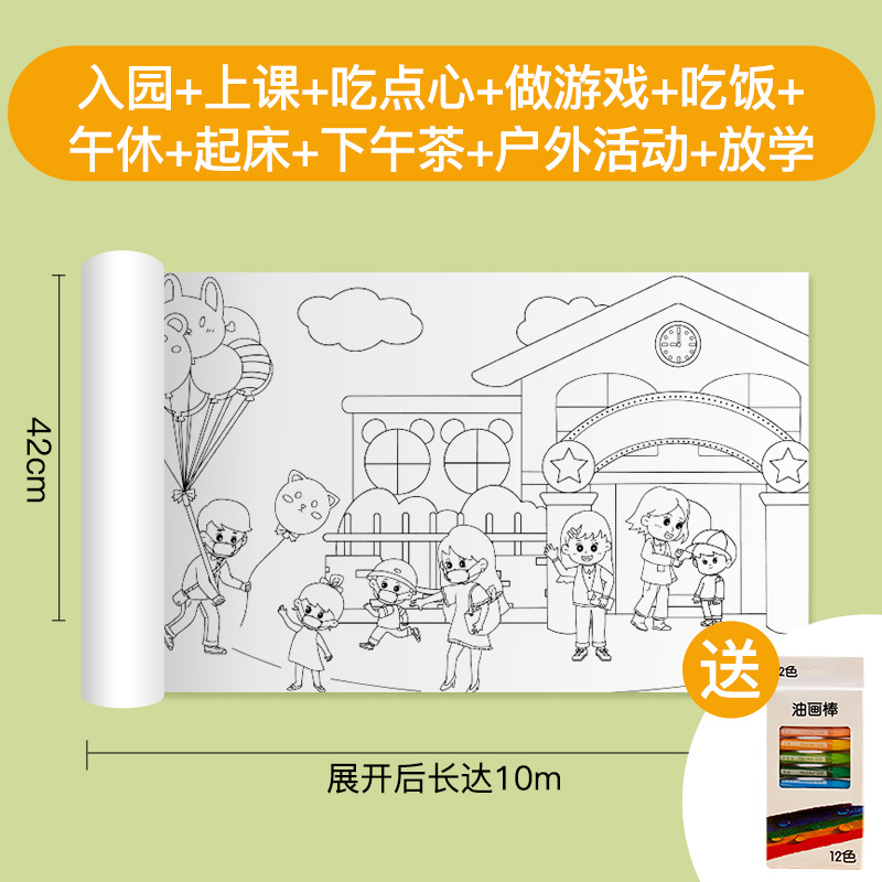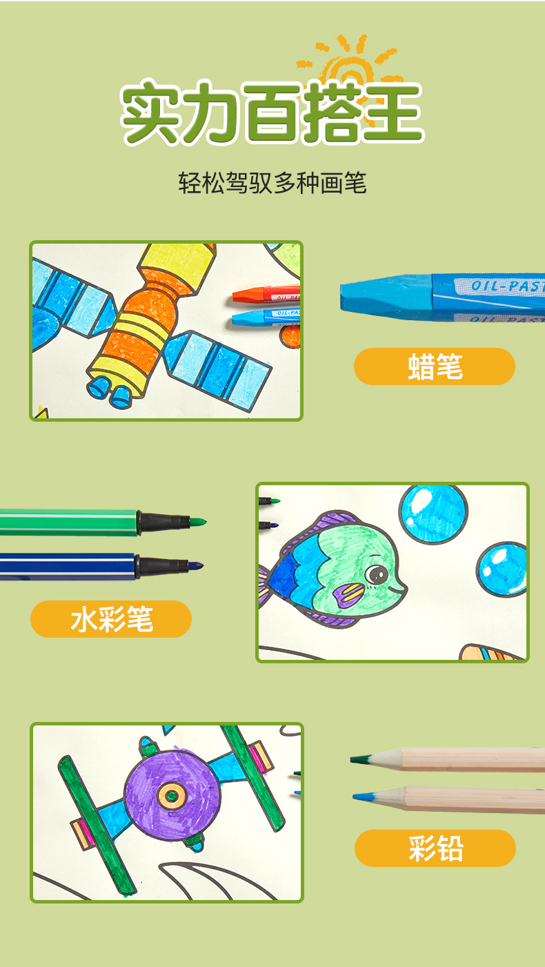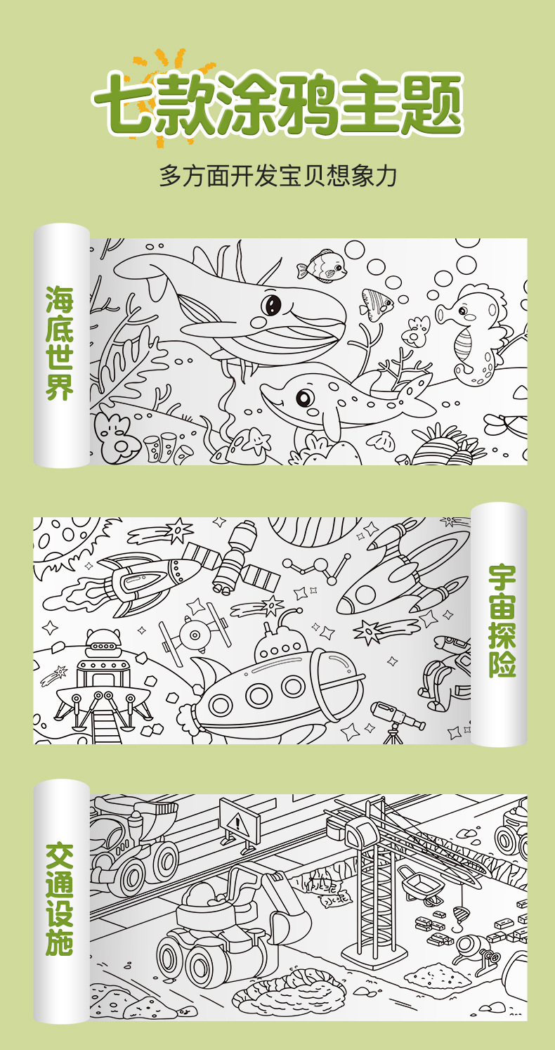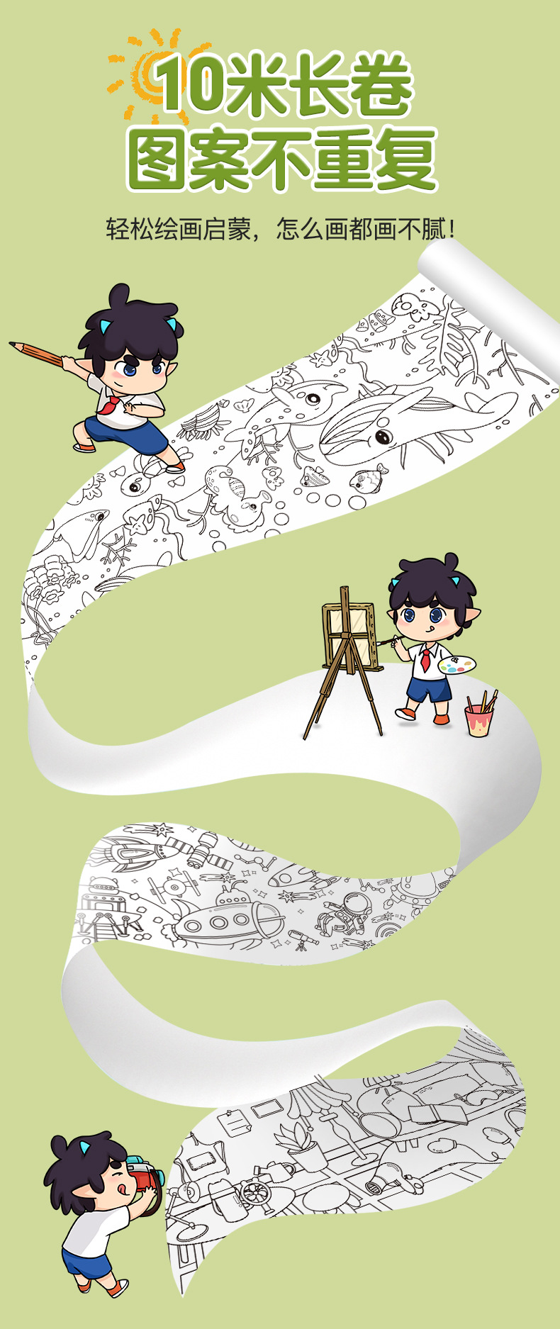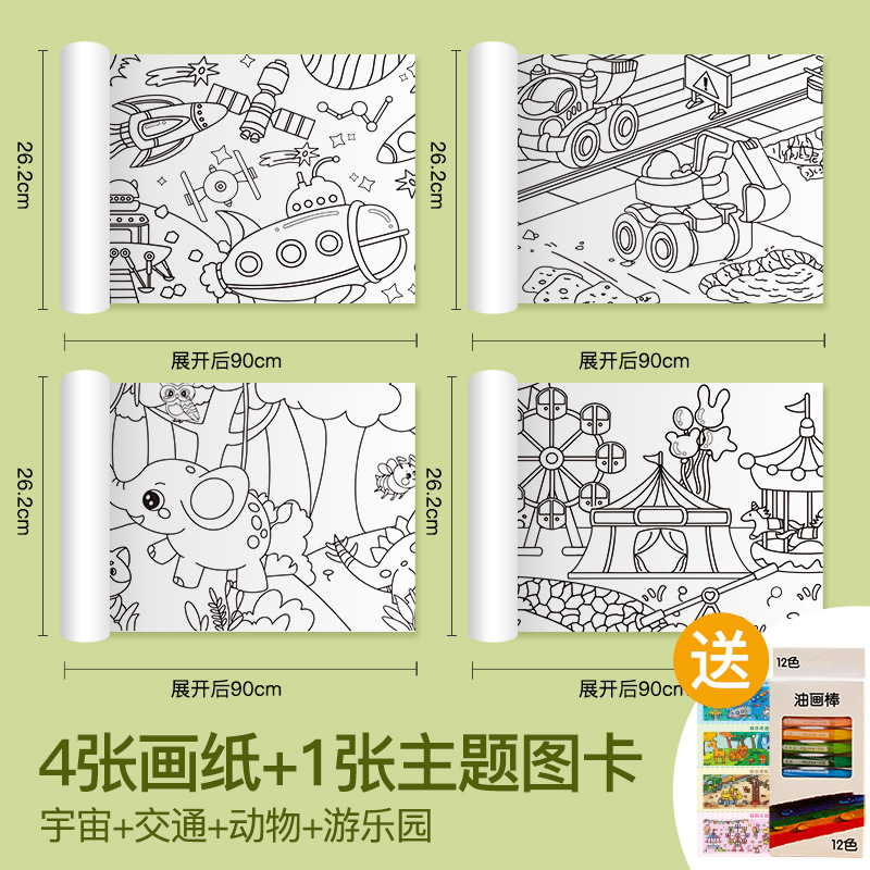 • 10 미터 그림 스크롤 (수중 세계 + 교통 시설 + 미식가 재능 + 재미있는 생활 + 우주 모험 + 동물의 세계 + 놀이터) + 12 색 유화 스틱