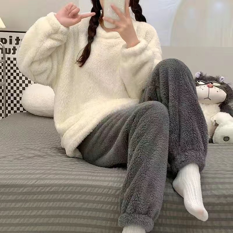 겨울 플란넬 크루넥 잠옷 여자의 긴 소매 새로운 따뜻한 두꺼운 기모 잠옷 기모 가정 의류 여자의 세트스토어 가기