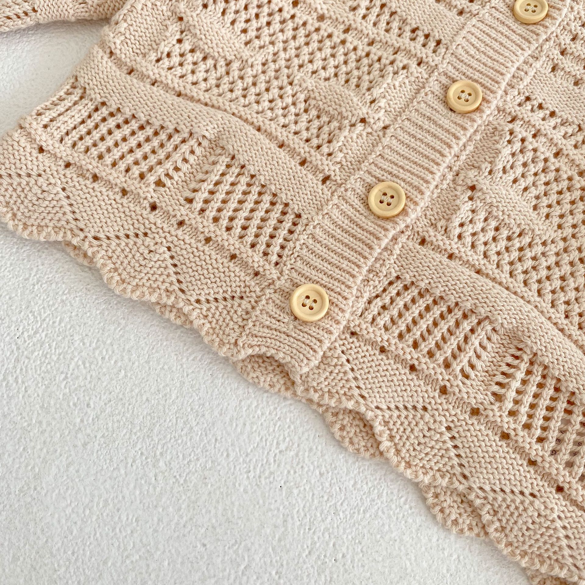 2023 봄 착용 아기 소녀 아기 니트 중공 패턴 스웨터 재킷 + 스트랩 하 이 2 조각 세트
