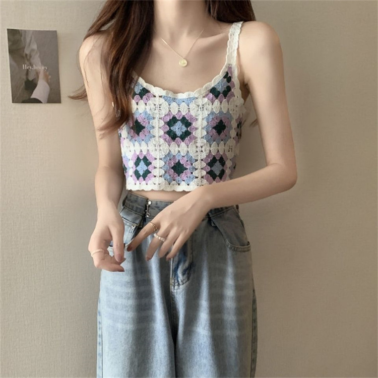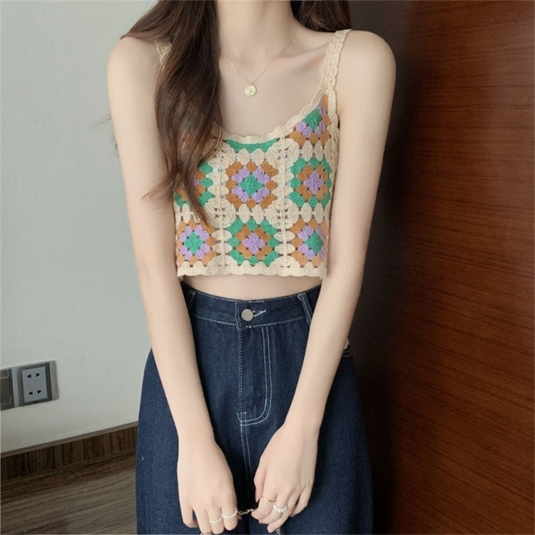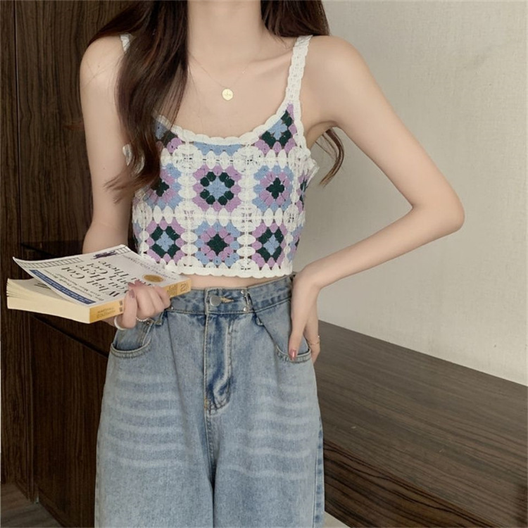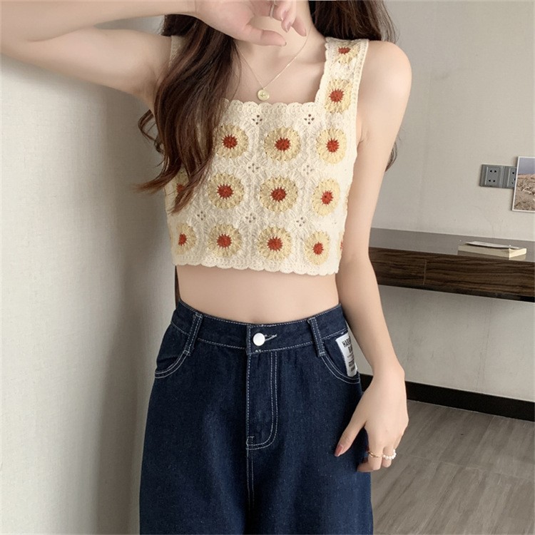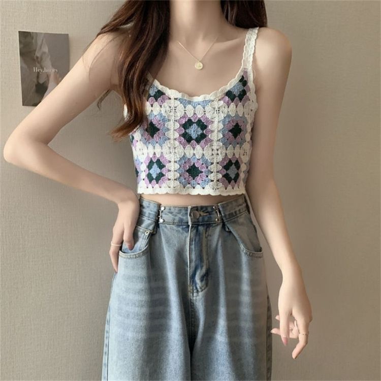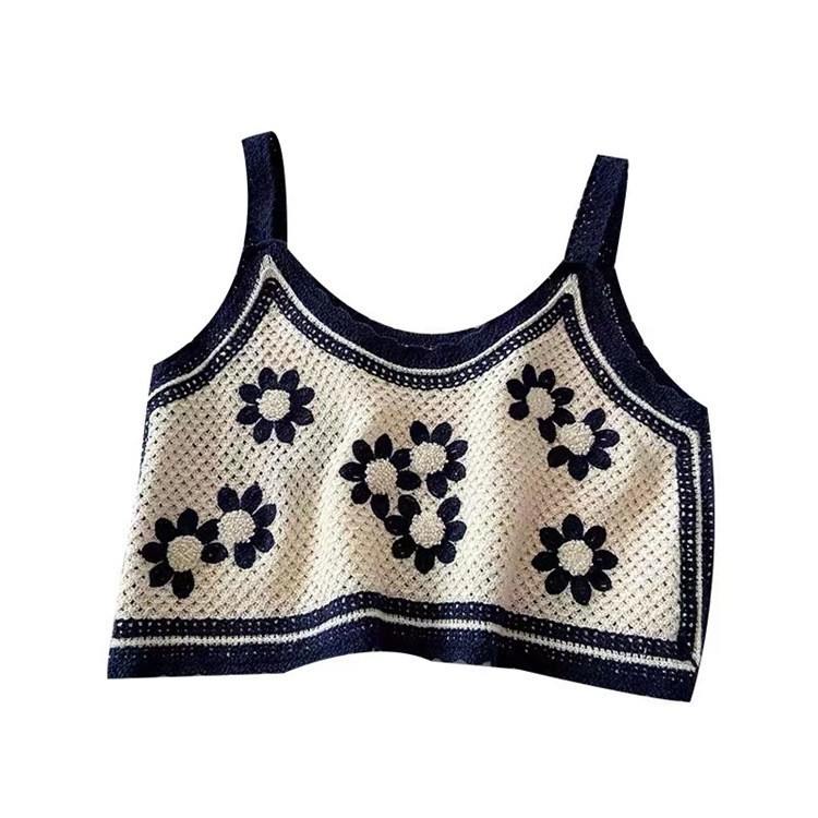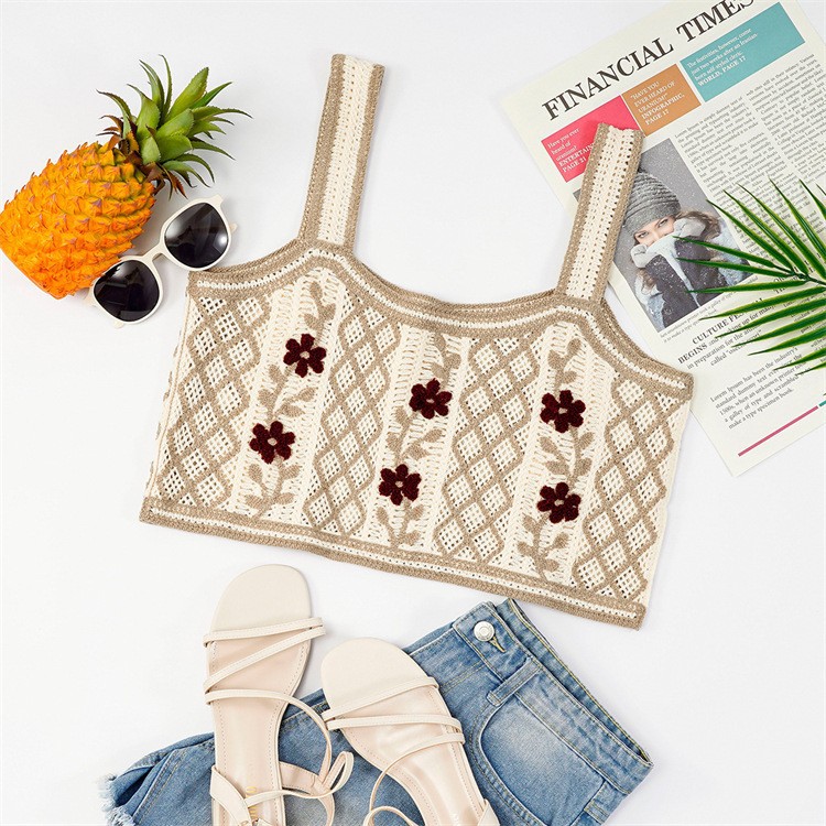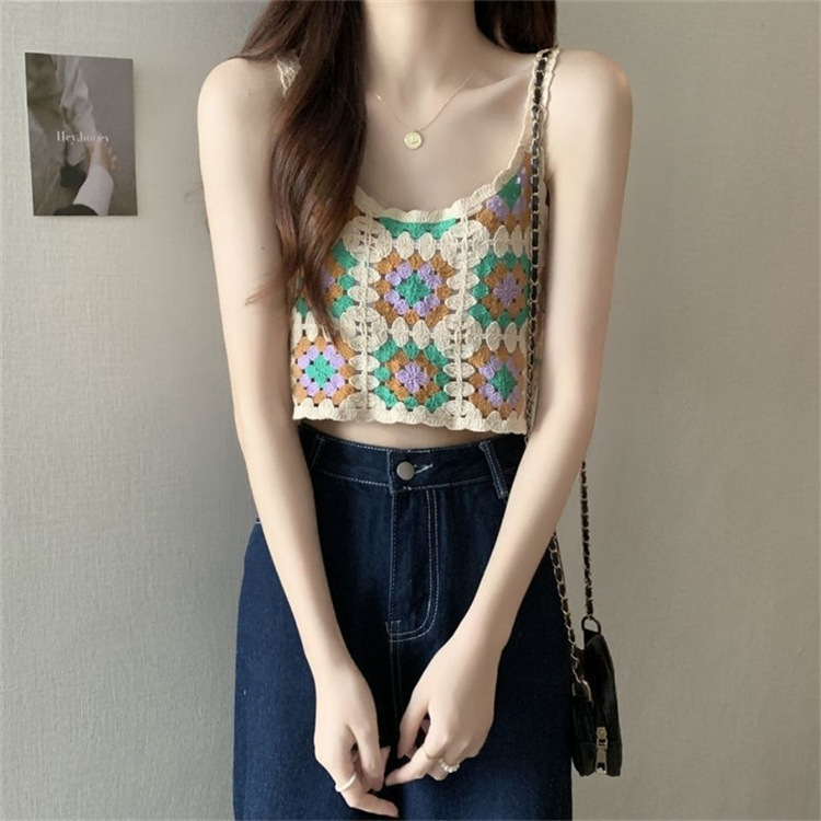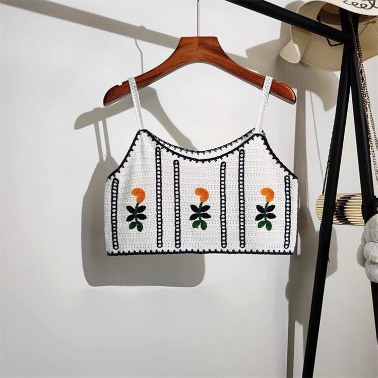 패션 섹시한 캐미솔 자수 중공 니트 짧은 여성 탑스토어 가기