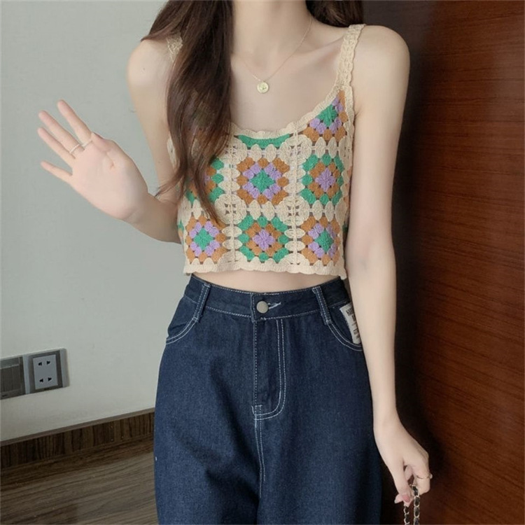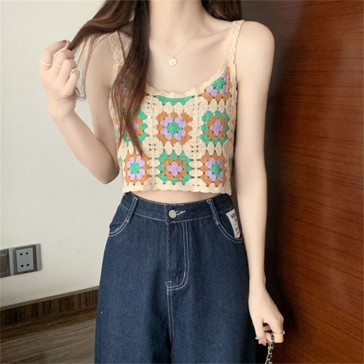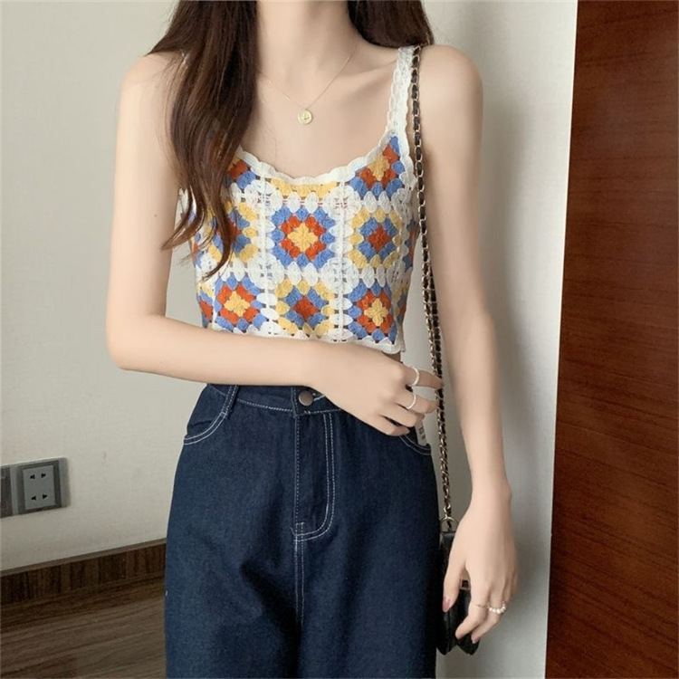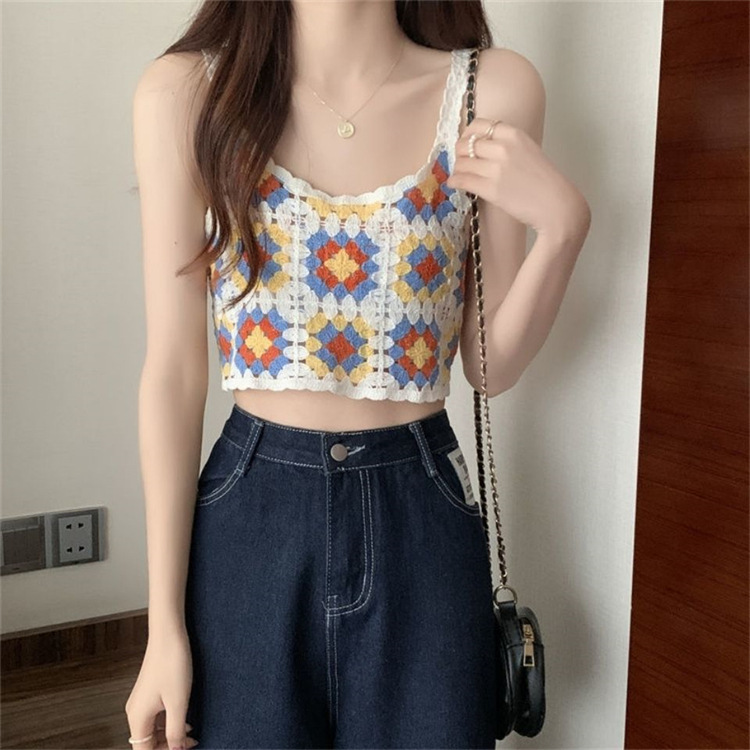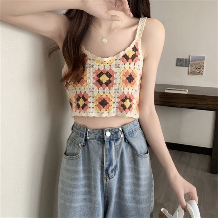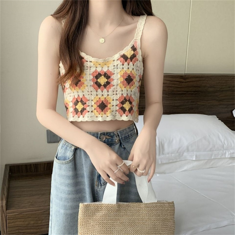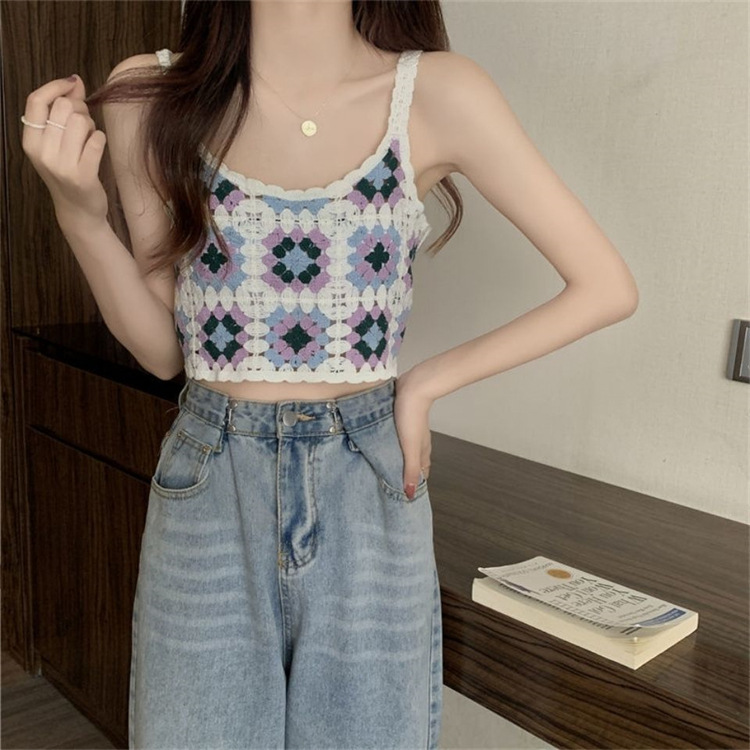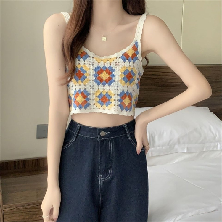 패션 섹시한 캐미솔 자수 중공 니트 짧은 여성 탑스토어 가기