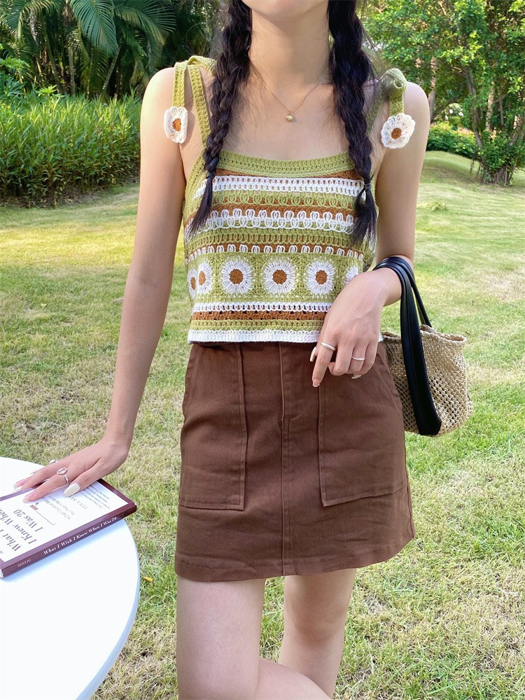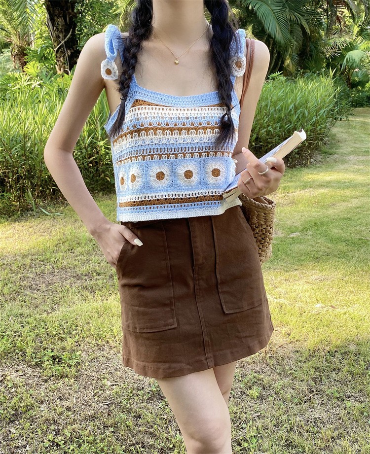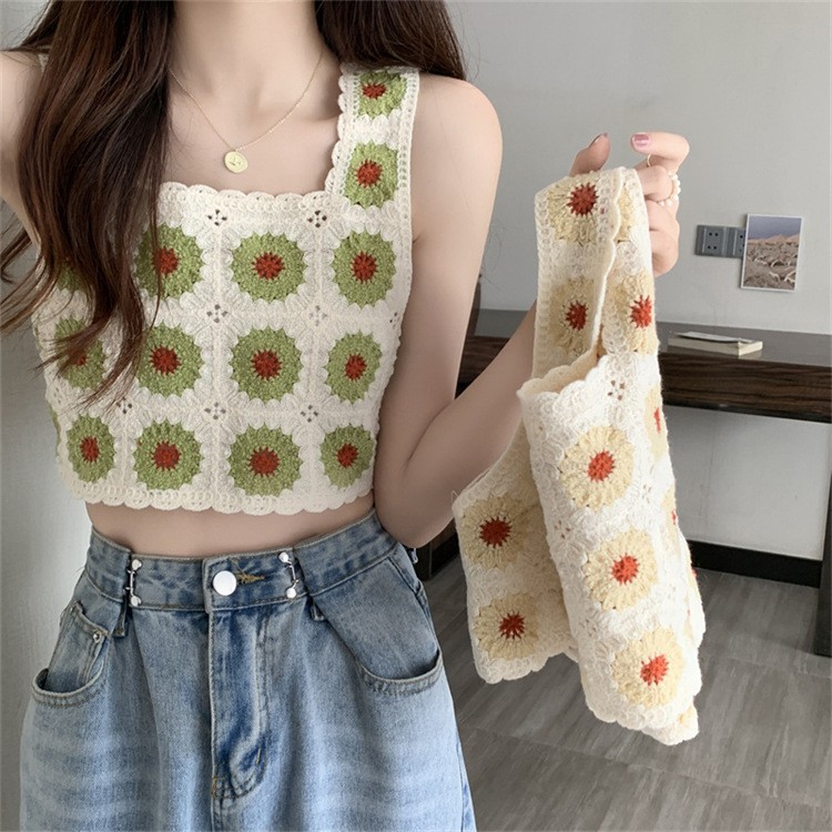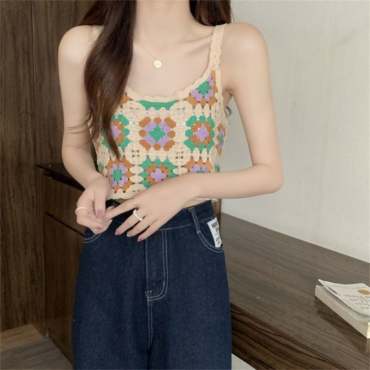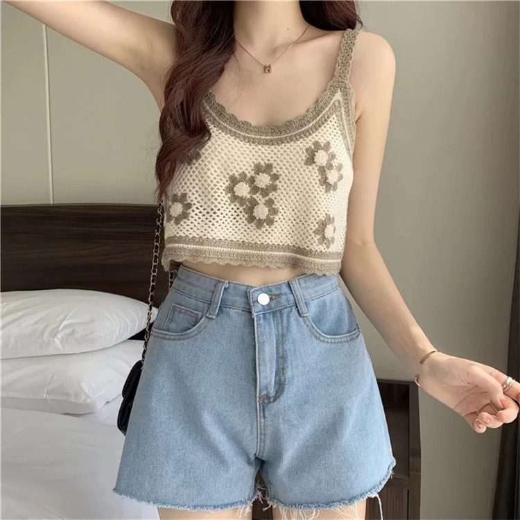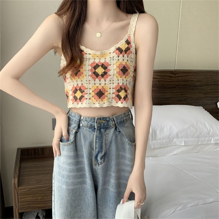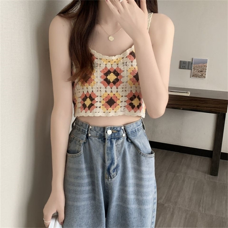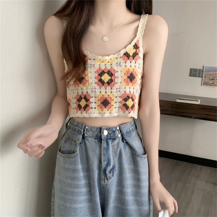 패션 섹시한 캐미솔 자수 중공 니트 짧은 여성 탑스토어 가기