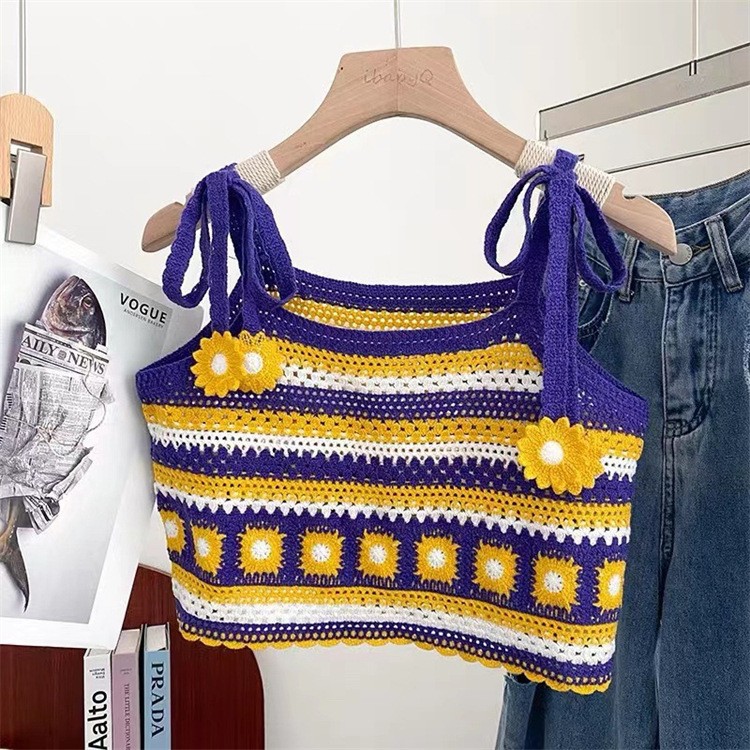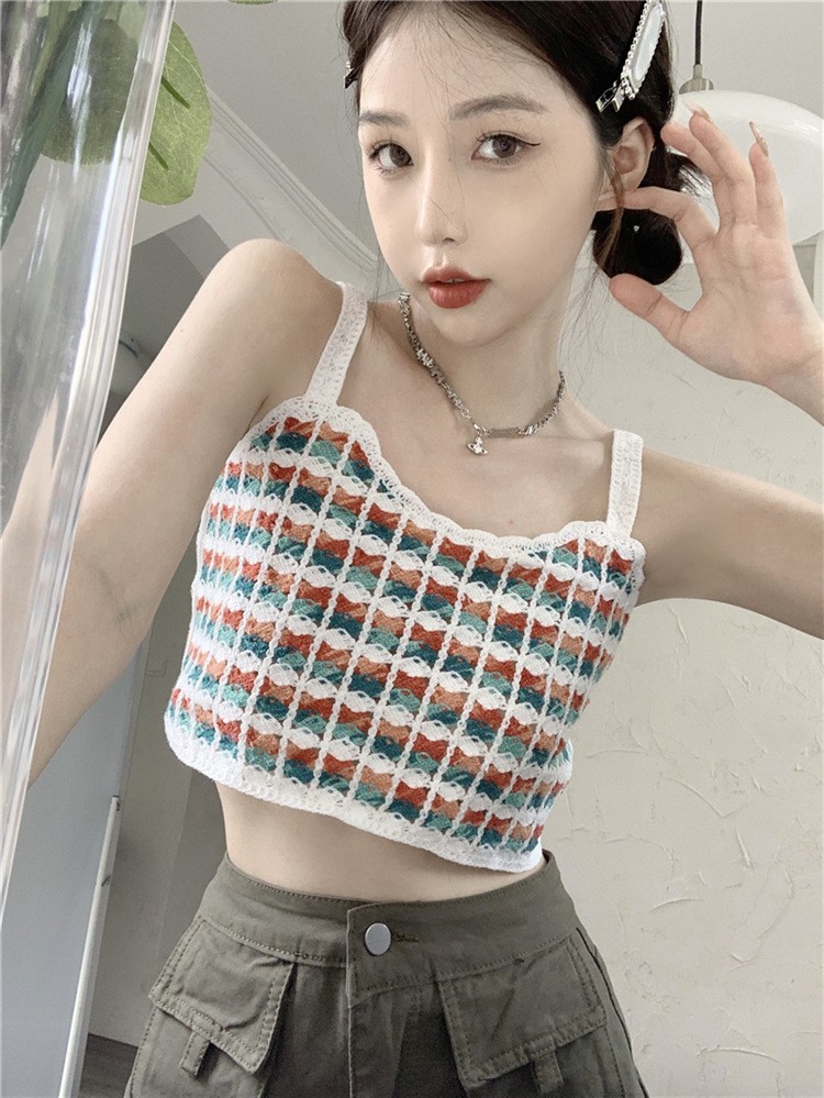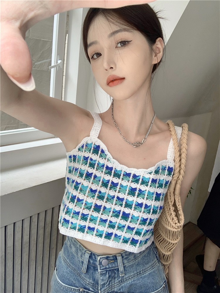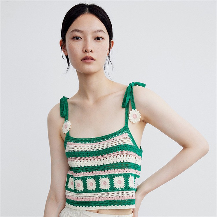 패션 섹시한 캐미솔 자수 중공 니트 짧은 여성 탑