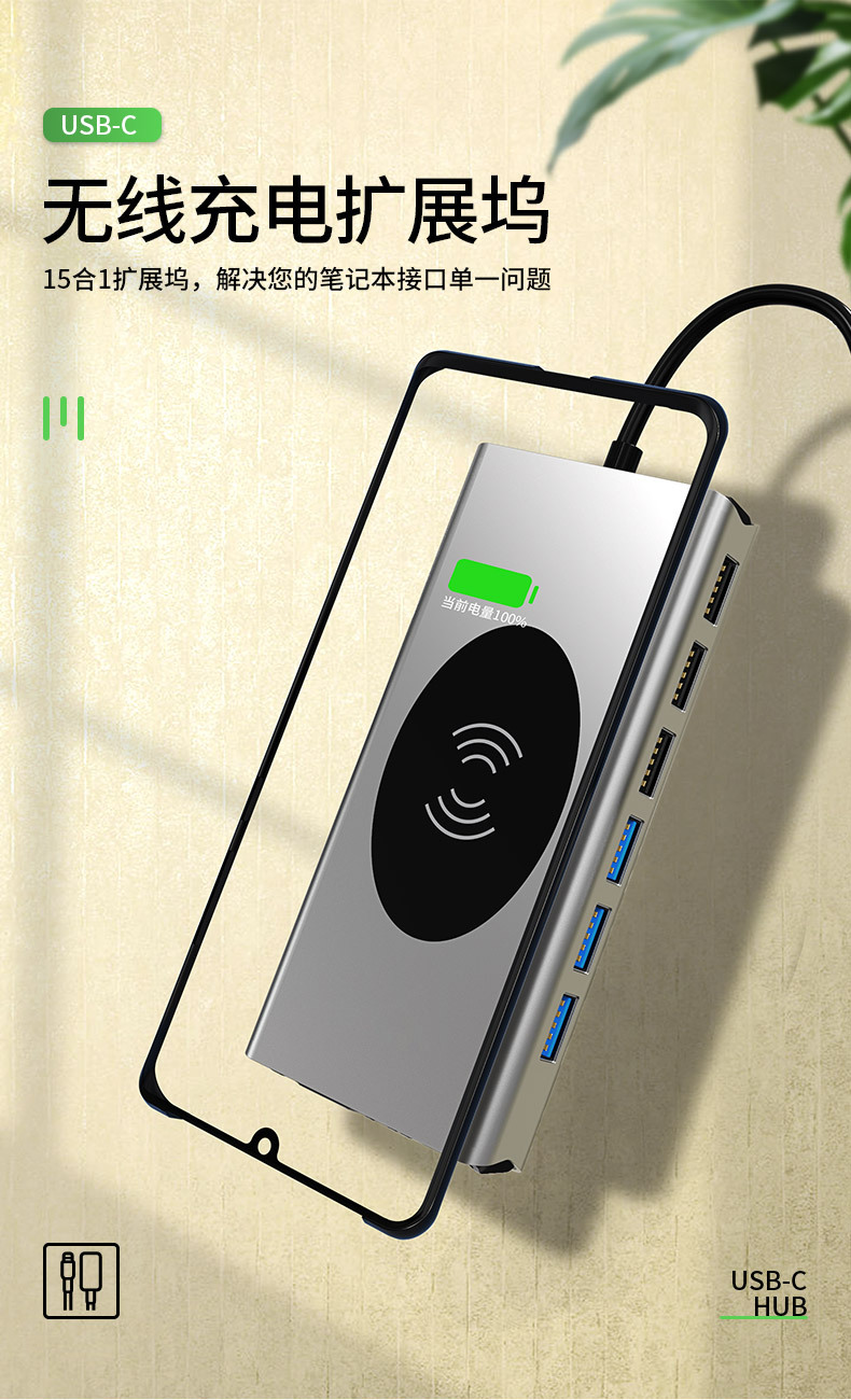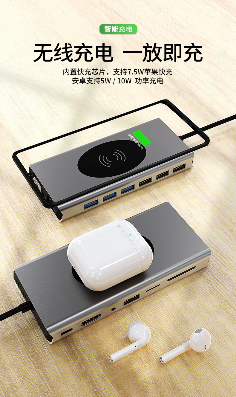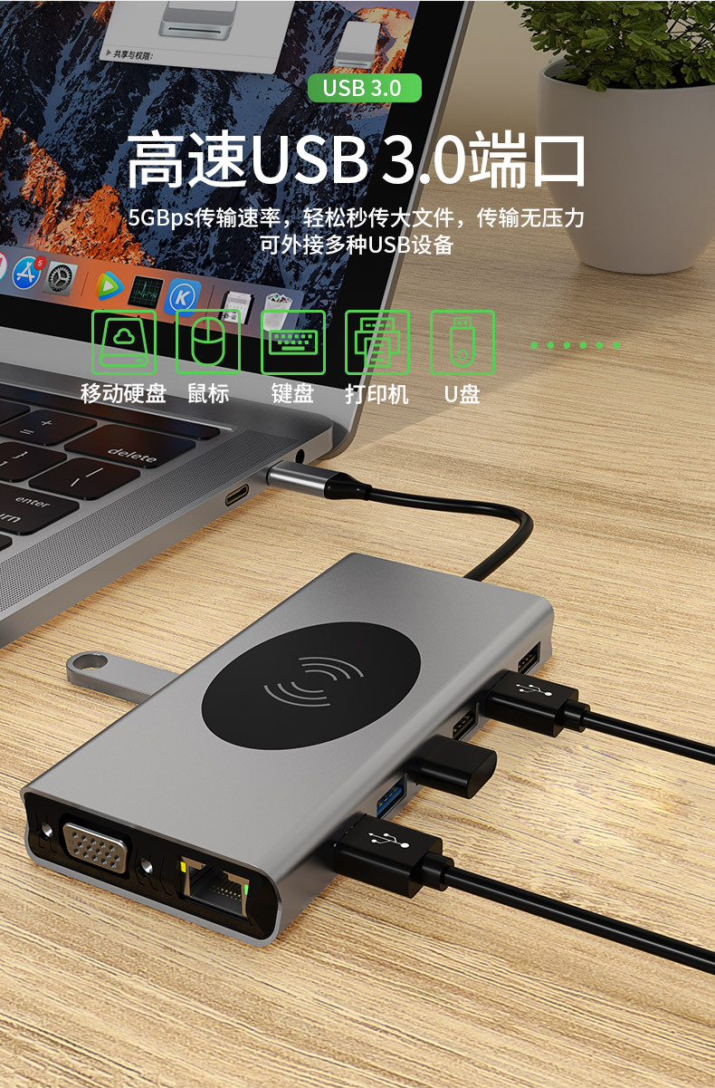크로스보더 타입-C 도킹 스테이션 USB 허브 15W 휴대폰 무선 충전기 USB3.0 기가비트 확장 스테이션스토어 가기