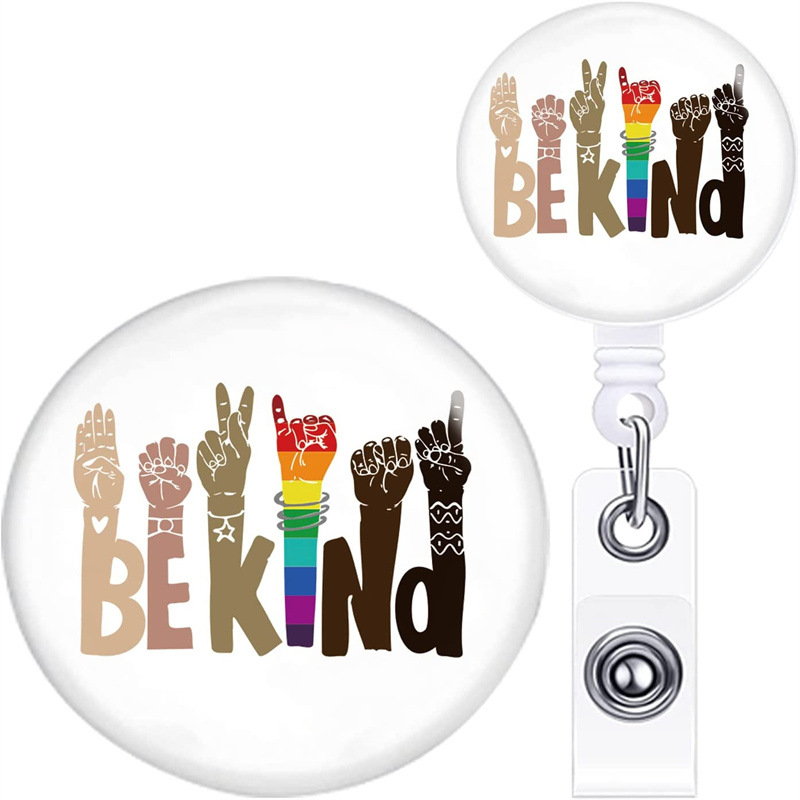 공장 재고 무지개 로고 언어 배지 릴 쉬운 풀 버클 제스처 Be 친절한 배지 카드 클립 장식스토어 가기