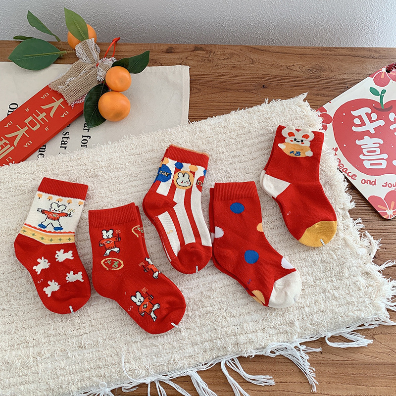 【반품 불가】어린이 양말 가을 겨울 설날 양말 토끼 양말 면 중간 길이 양말 빨간 양말 설날 스타일스토어 가기
