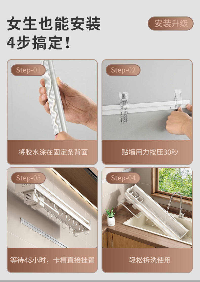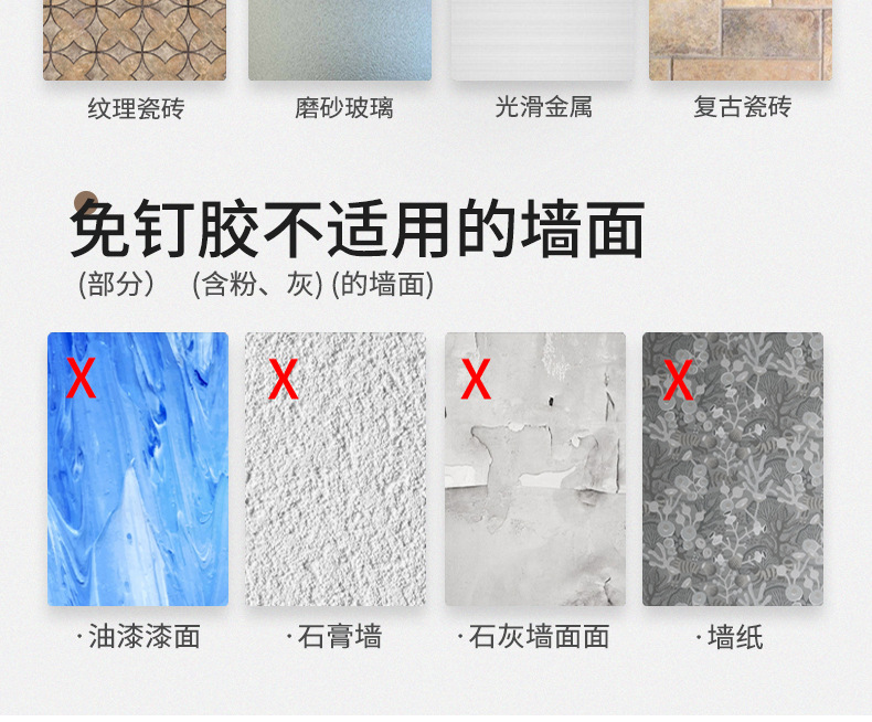 (2)安装请注意,墙面需平整坚固的玻璃瓷砖等。不可用在粉刷墙,墙纸,石灰墙等不平整不坚固的墙面上。涂胶上墙后需等待3-5天,免钉胶完全干透再使用!