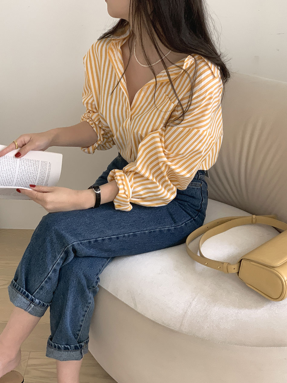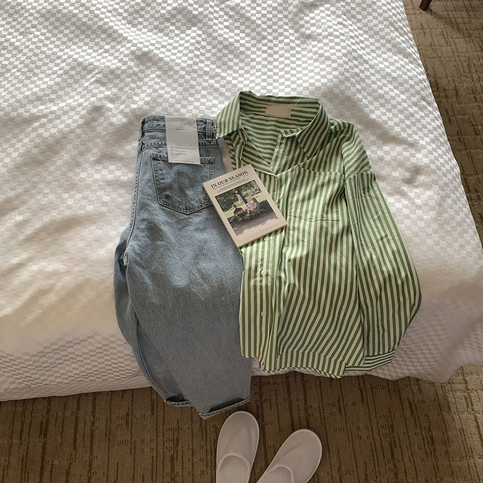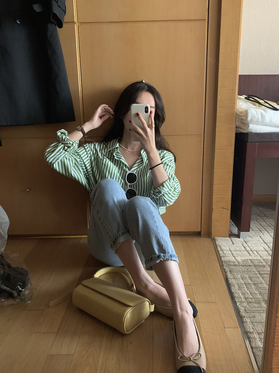 한국 세련된 여름 프랑스 스타일 틈새 옷깃 패션 캐주얼 느슨한 흰색 녹색 줄무늬 셔츠 탑스토어 가기