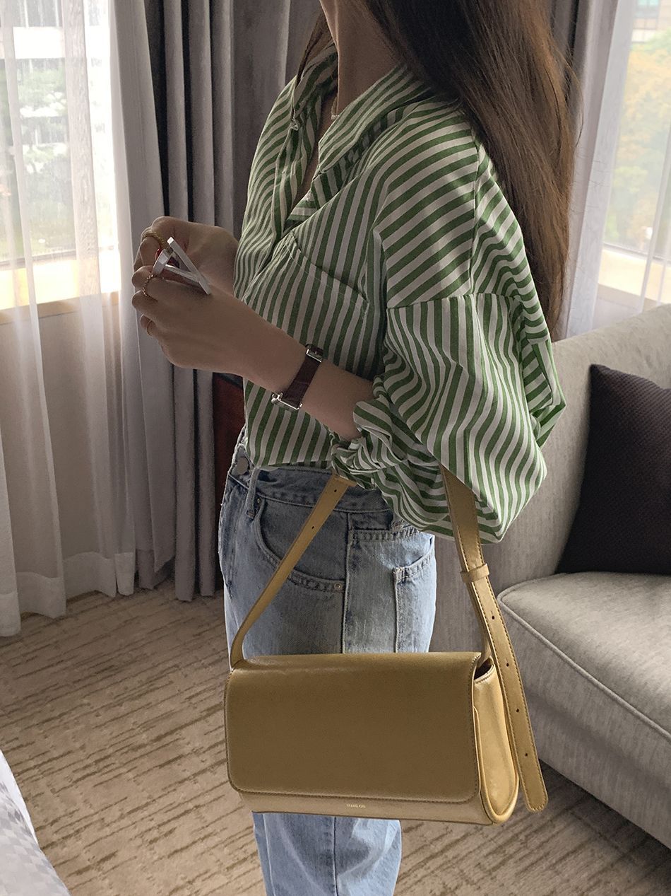 한국 세련된 여름 프랑스 스타일 틈새 옷깃 패션 캐주얼 느슨한 흰색 녹색 줄무늬 셔츠 탑