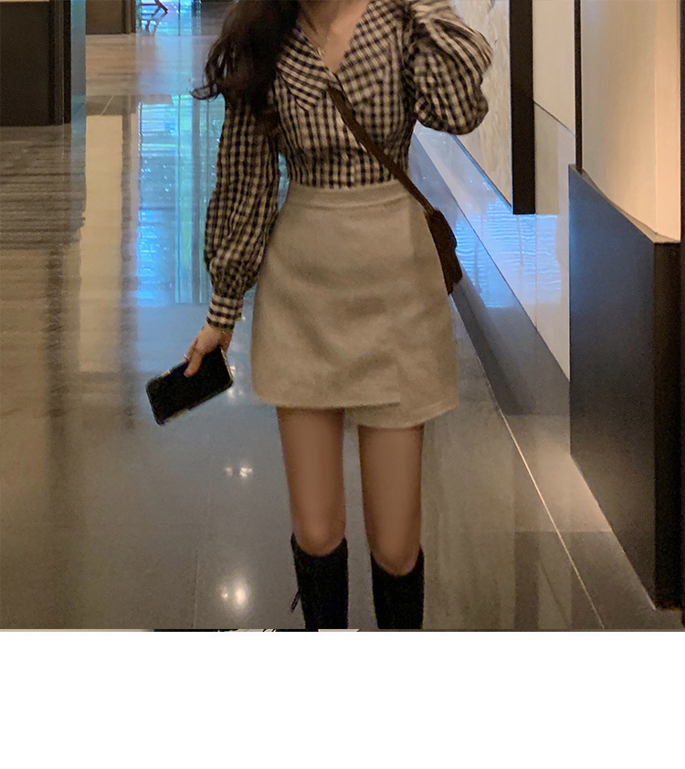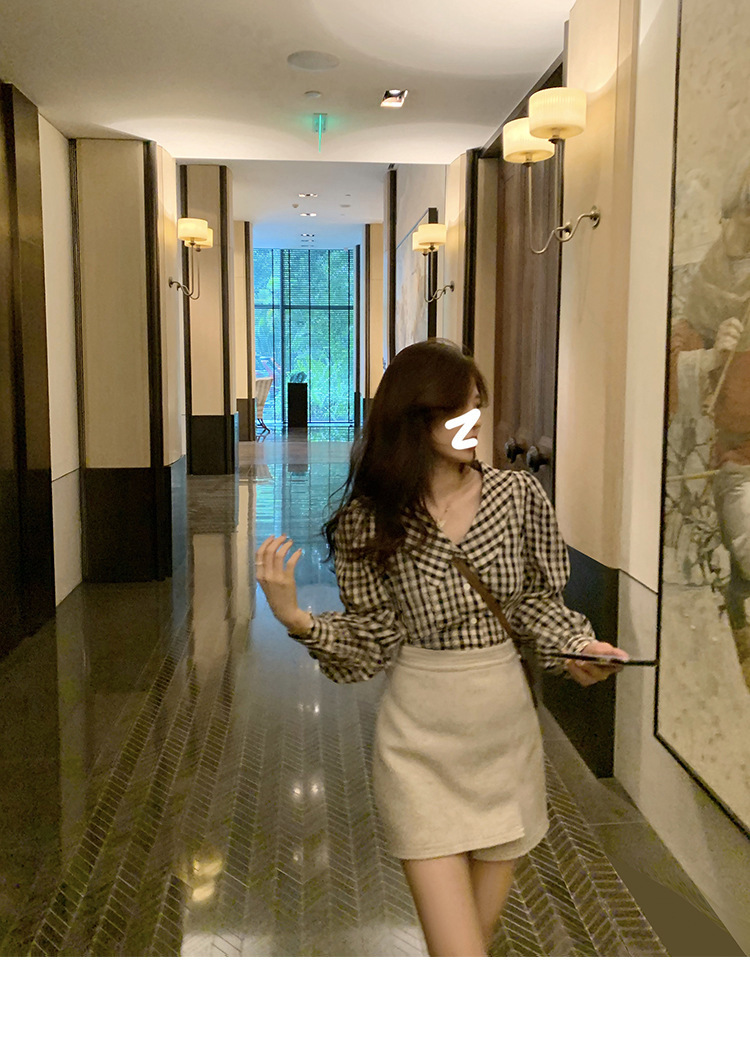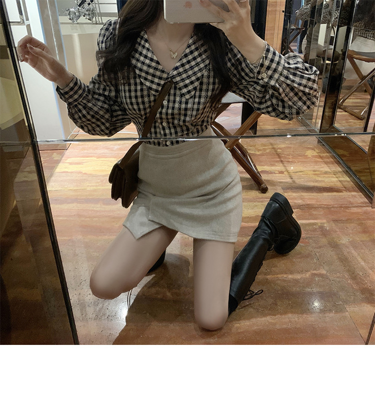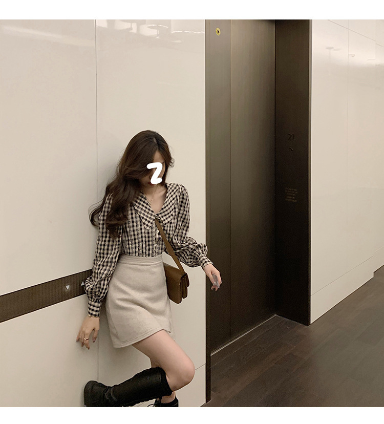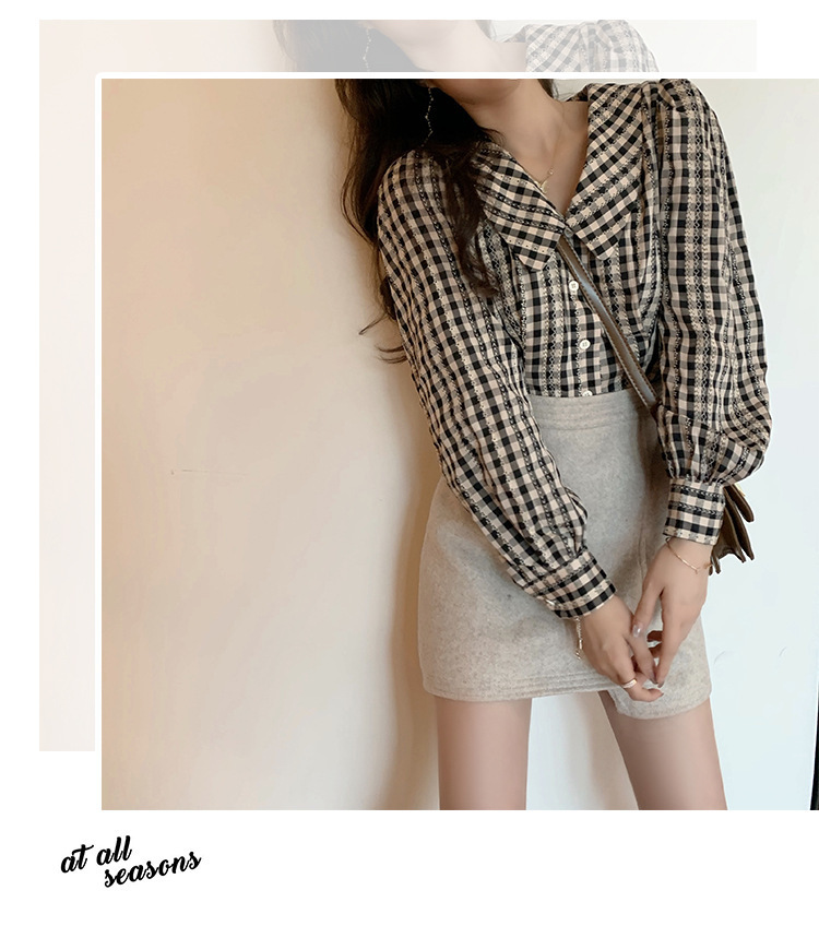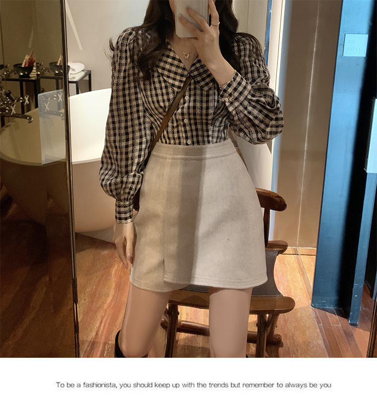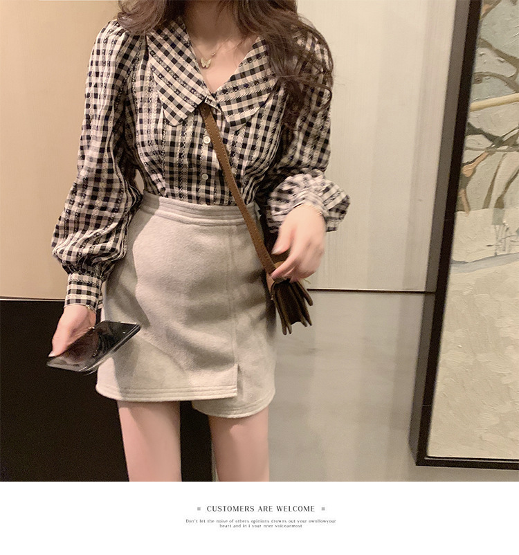 홍콩 스타일 빈티지 격자 셔츠 여성의 가을과 겨울 인형 칼라 긴 소매 랜턴 슬리브 셔츠 디자인 센스 틈새 쇼트 탑스토어 가기