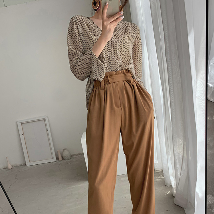 2021 년 봄과 가을 새로운 한국 스타일 분할 인쇄 쉬폰 셔츠 스타일 레트로 우아한 V 넥 긴 소매 셔츠 여성용 트렌디