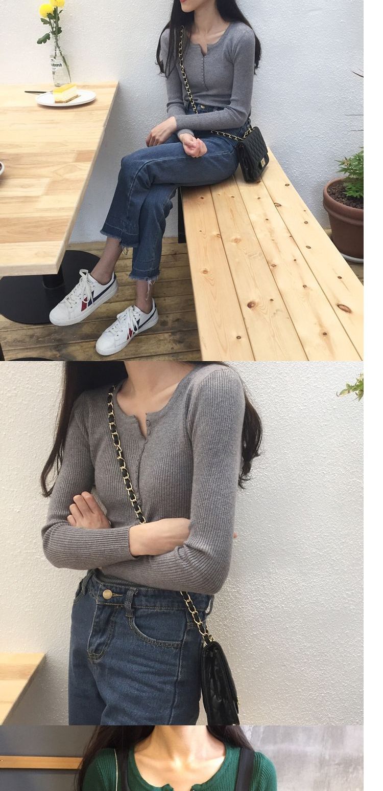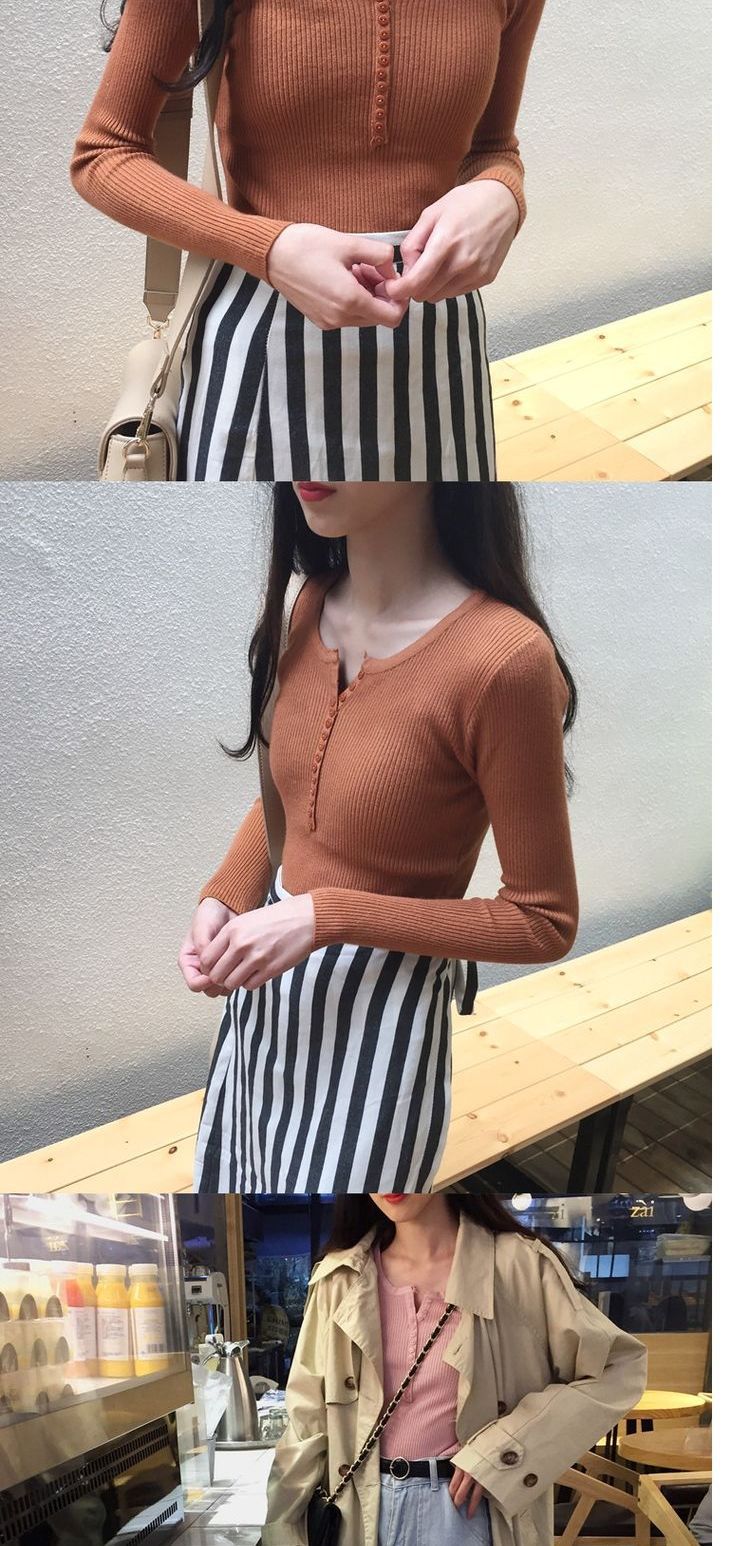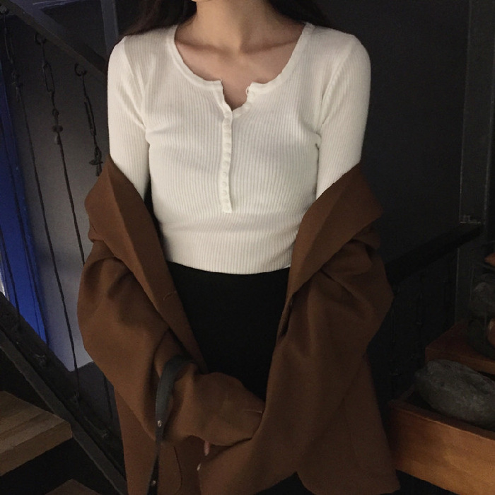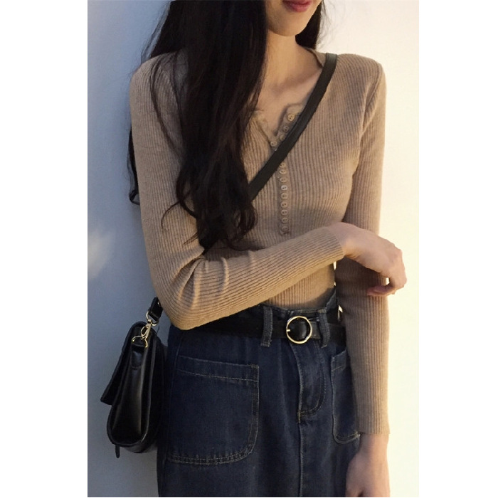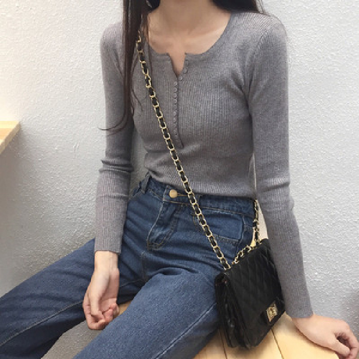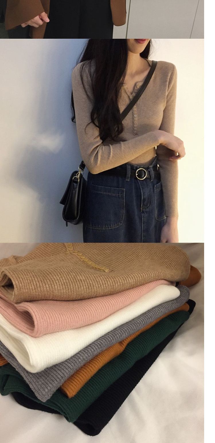가을과 겨울 여성용 V-넥 풀오버 니트베이스 셔츠 학생 슬리밍 긴팔 티셔츠 세련된 타이트 탑 내부 스웨터스토어 가기