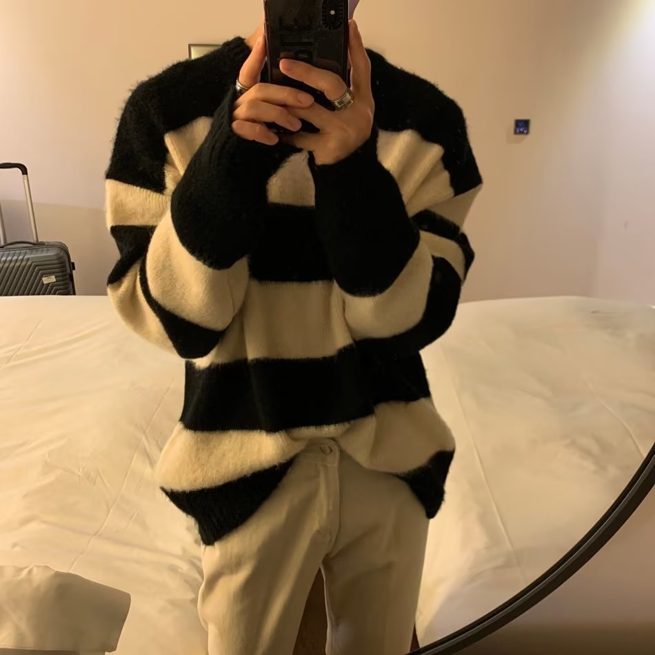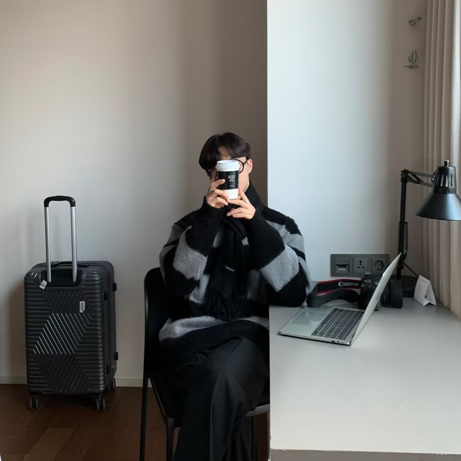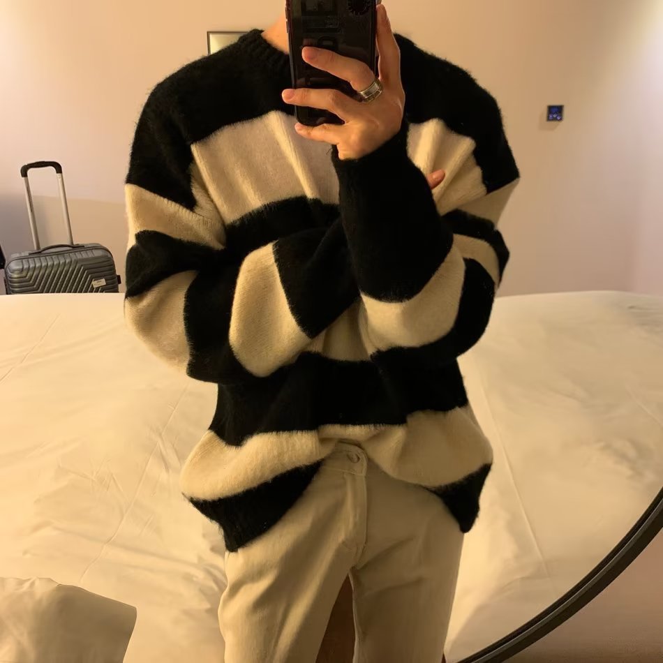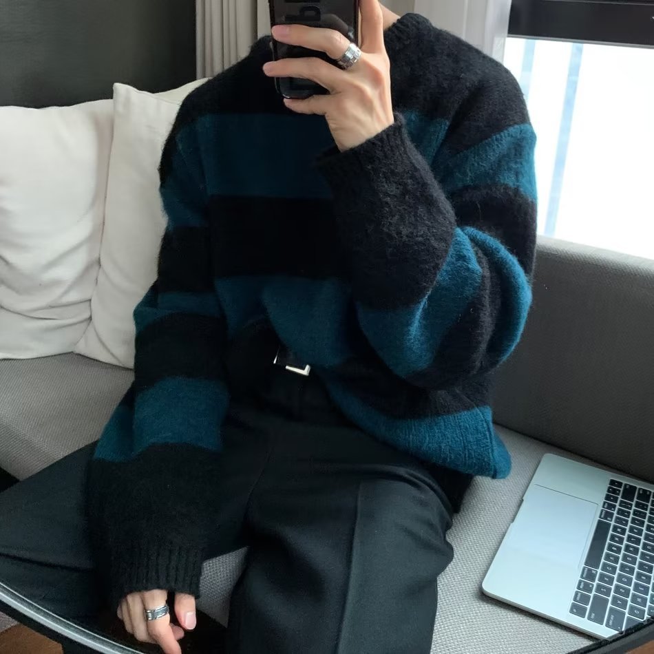 크루넥 스티칭 디자인 부드러운 밀랍 스웨터 가을과 겨울 새 스웨터 느슨한 스트라이프 탑 트렌디 한 남성용 트렌디 한 헤어스토어 가기