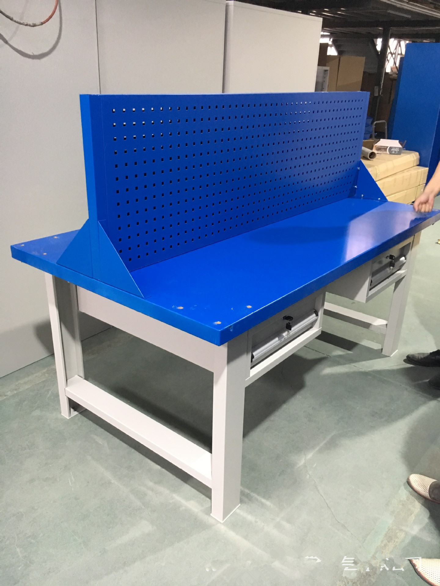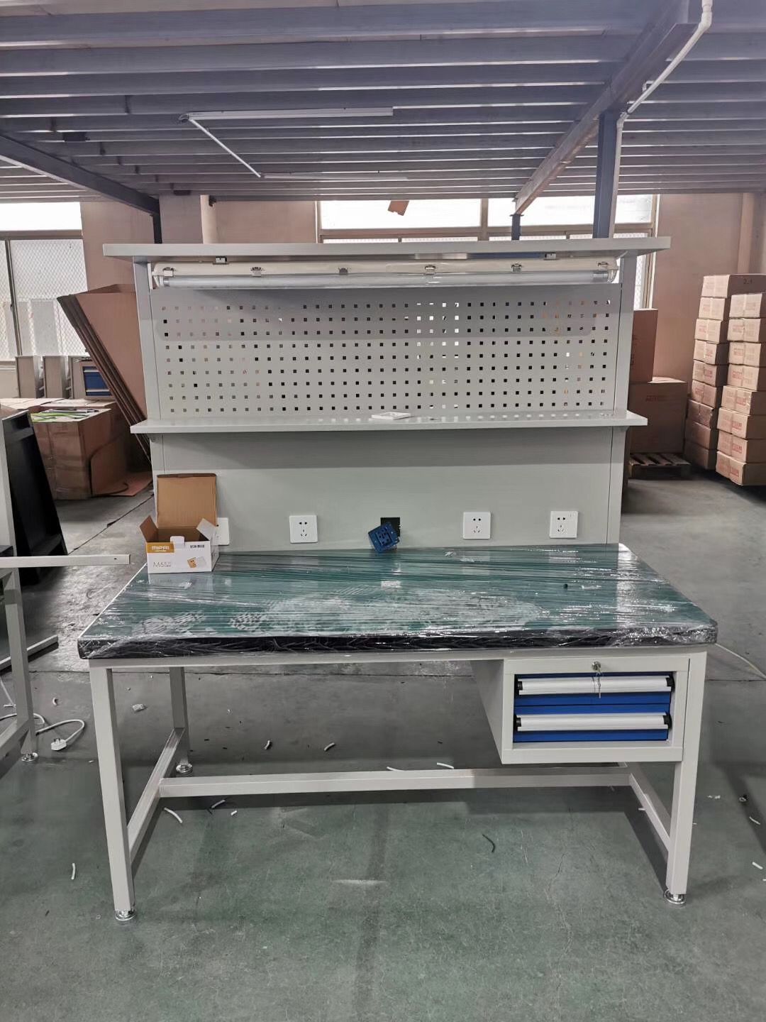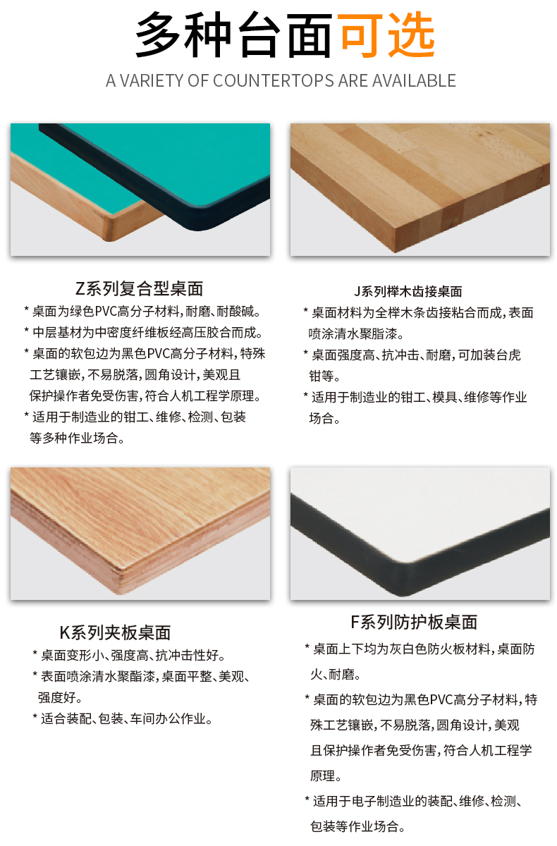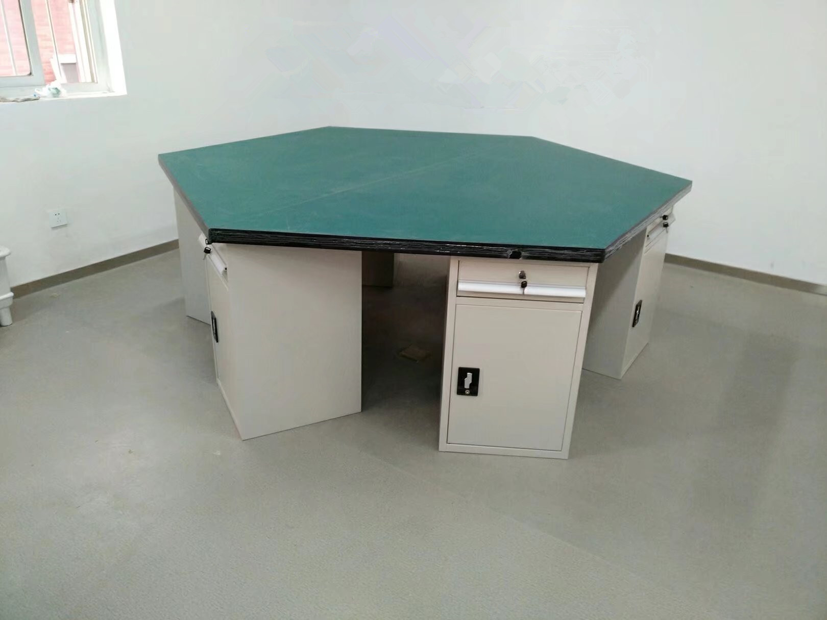2.确定桌子的台面要求,常规用复合台面的占多数,即50mm的高压合成板上黏贴一层胶皮,胶皮有耐冲击,适合敲敲打打不易变形,或者耐磨胶皮,防静电胶皮等,相对价格实惠,性价比高!或者可选择包铁皮,包不锈钢,压钢板,或实木台面,可咨询客服,客服会根据您的要求一一为您解答。