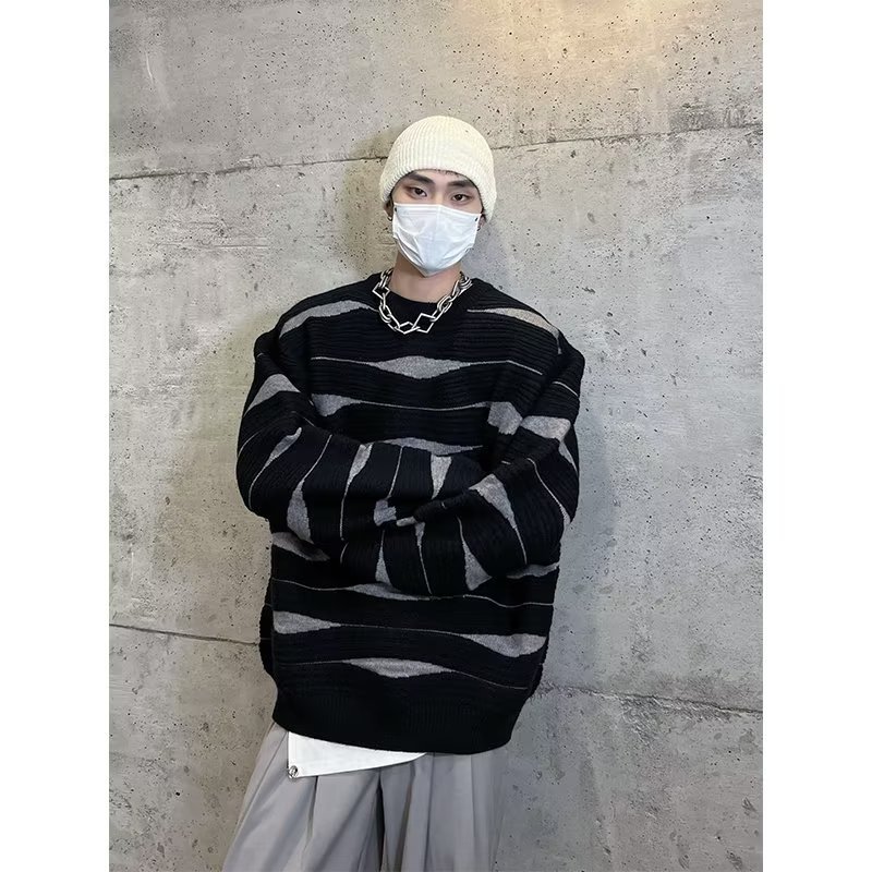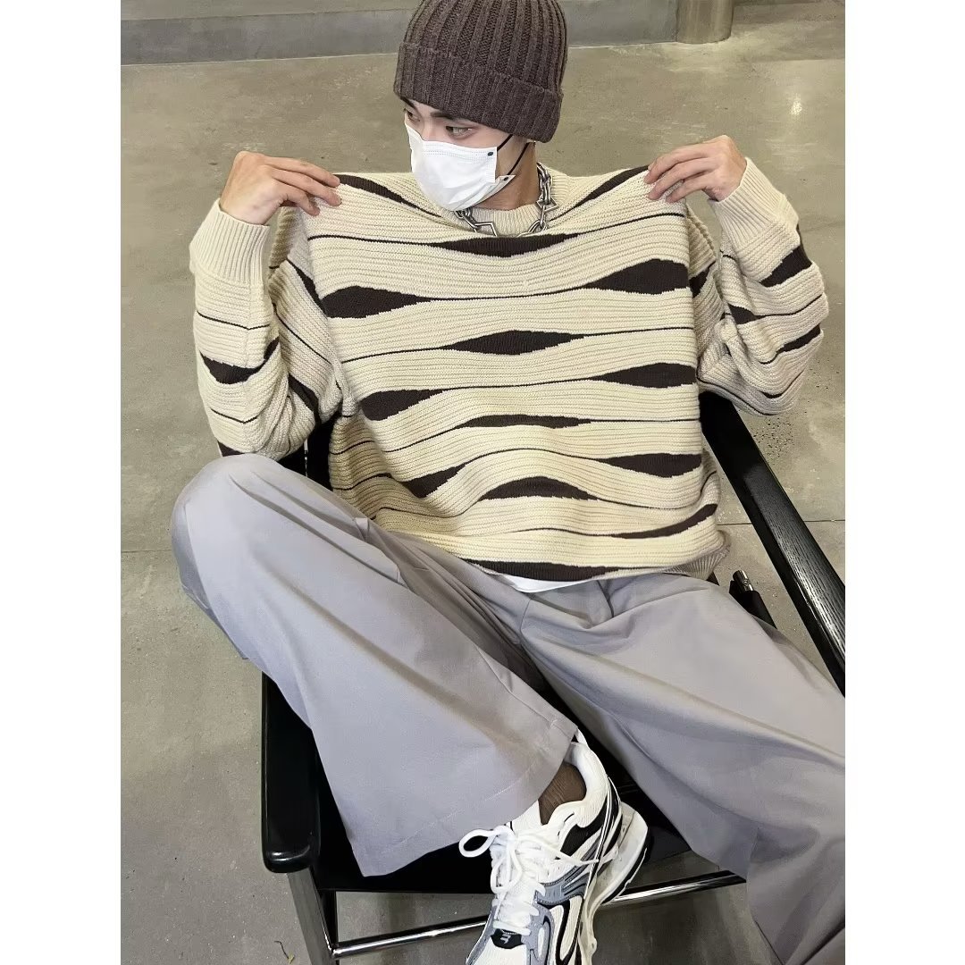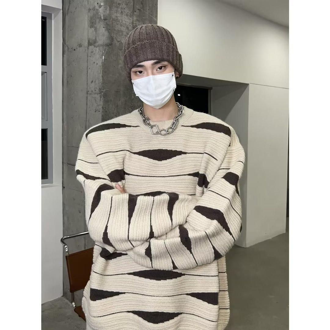 불규칙한 대조 색상 물결 모양 스웨터 남자의 가을과 겨울 디자인 감각 두꺼운 느슨한 풀오버 스티치 스트라이프 스웨터 유행스토어 가기