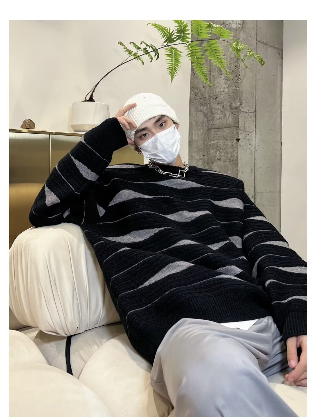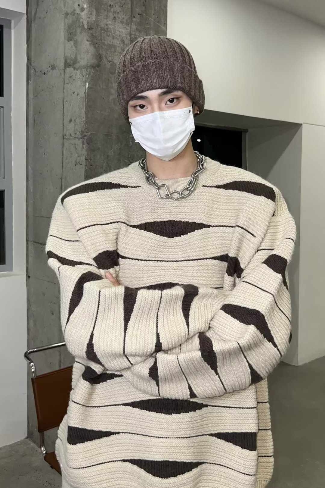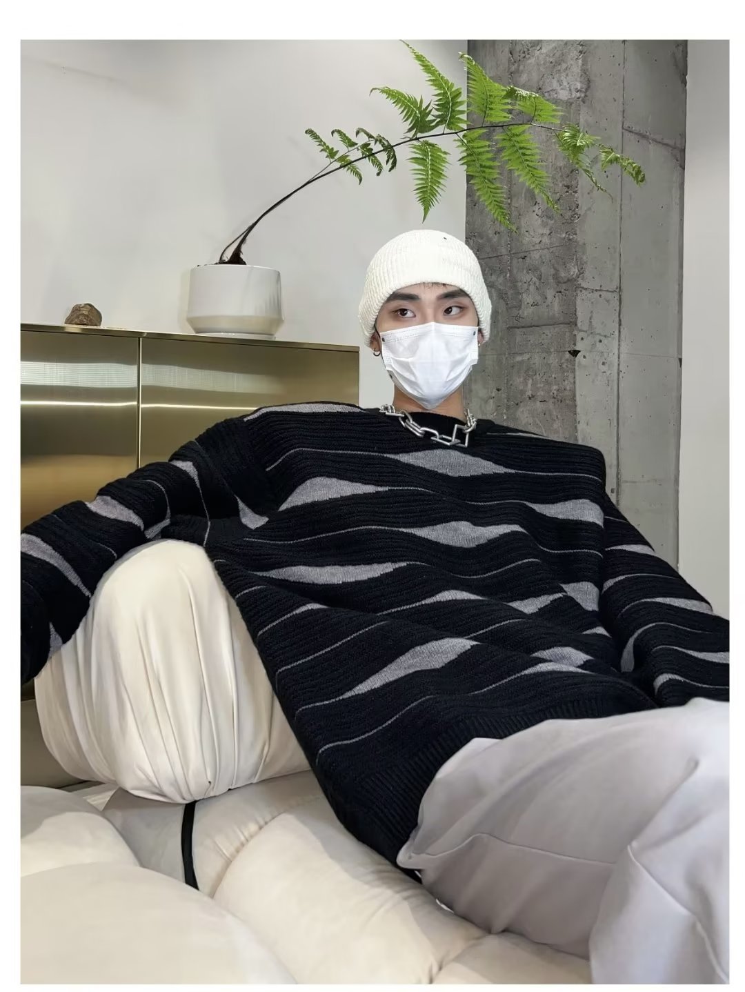불규칙한 대조 색상 물결 모양 스웨터 남자의 가을과 겨울 디자인 감각 두꺼운 느슨한 풀오버 스티치 스트라이프 스웨터 유행스토어 가기