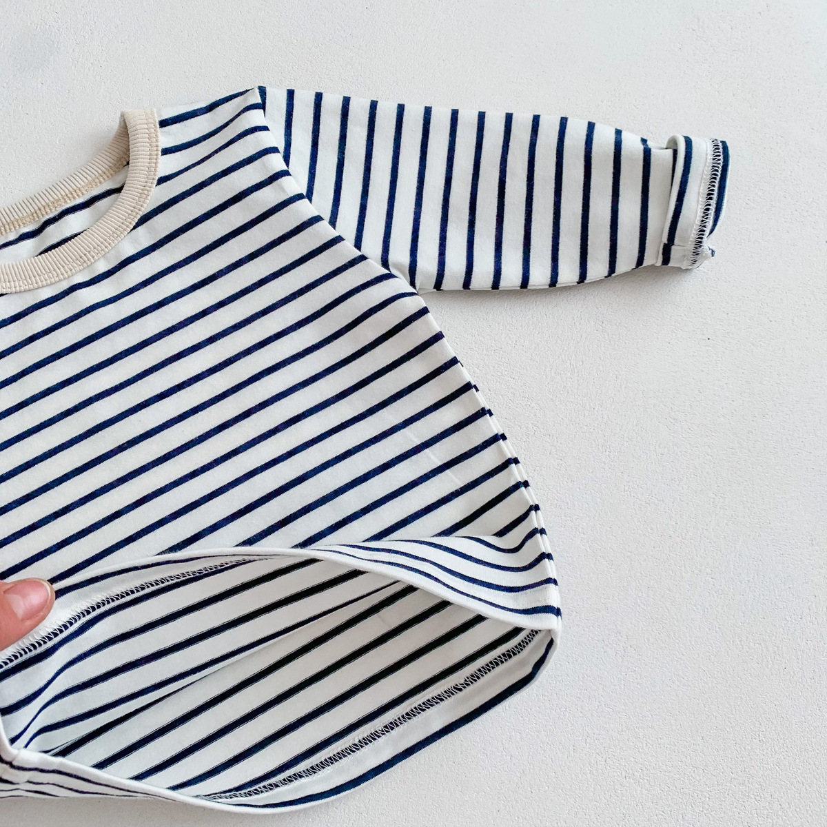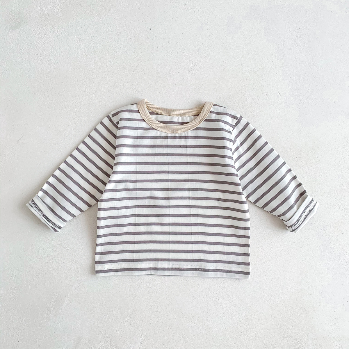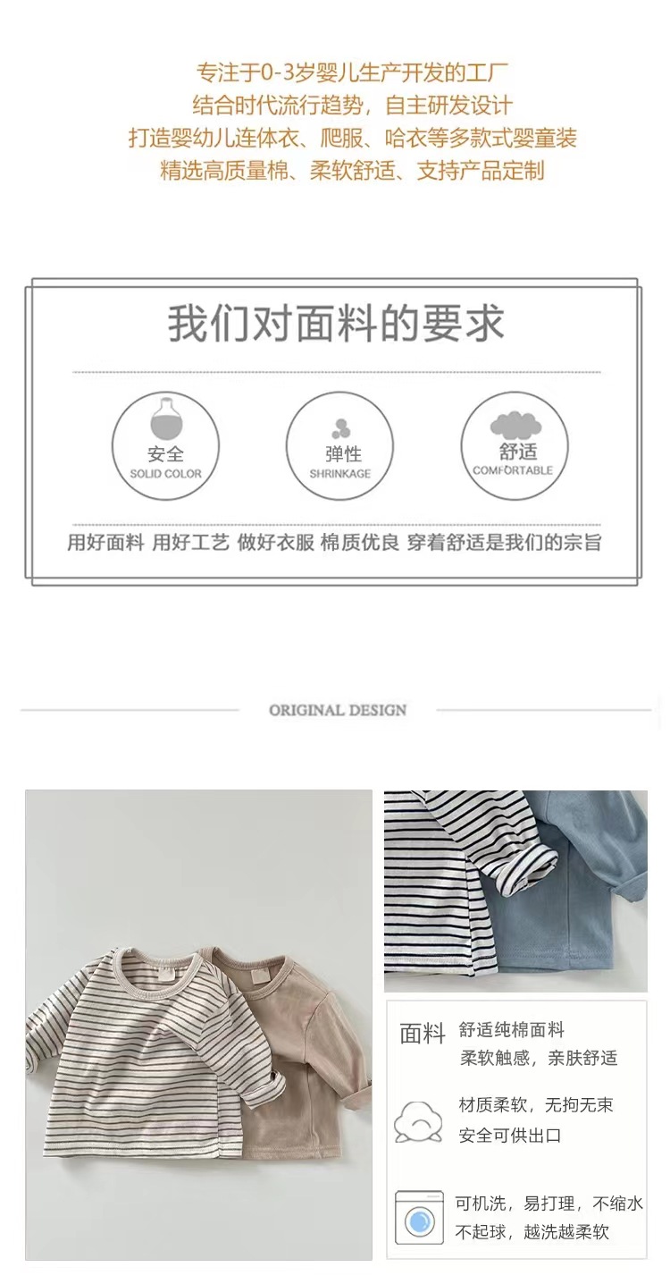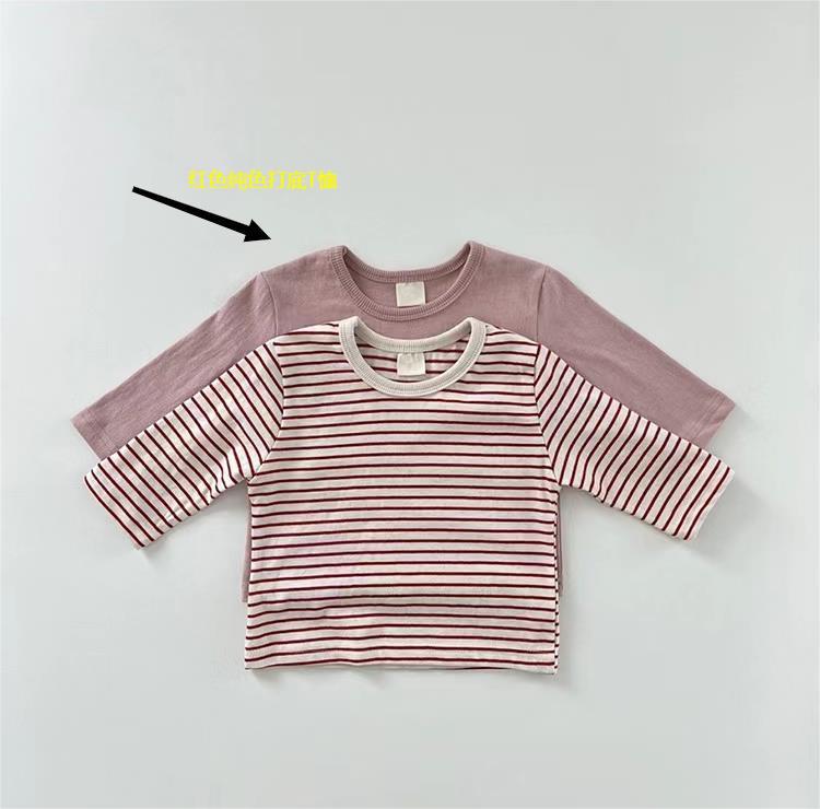 한국 스타일 아동복 스팟 봄, 가을 긴팔 티셔츠 유아, 남성 및 여성 베이비 라운드 넥 솔리드 컬러 스트라이프 바닥 탑