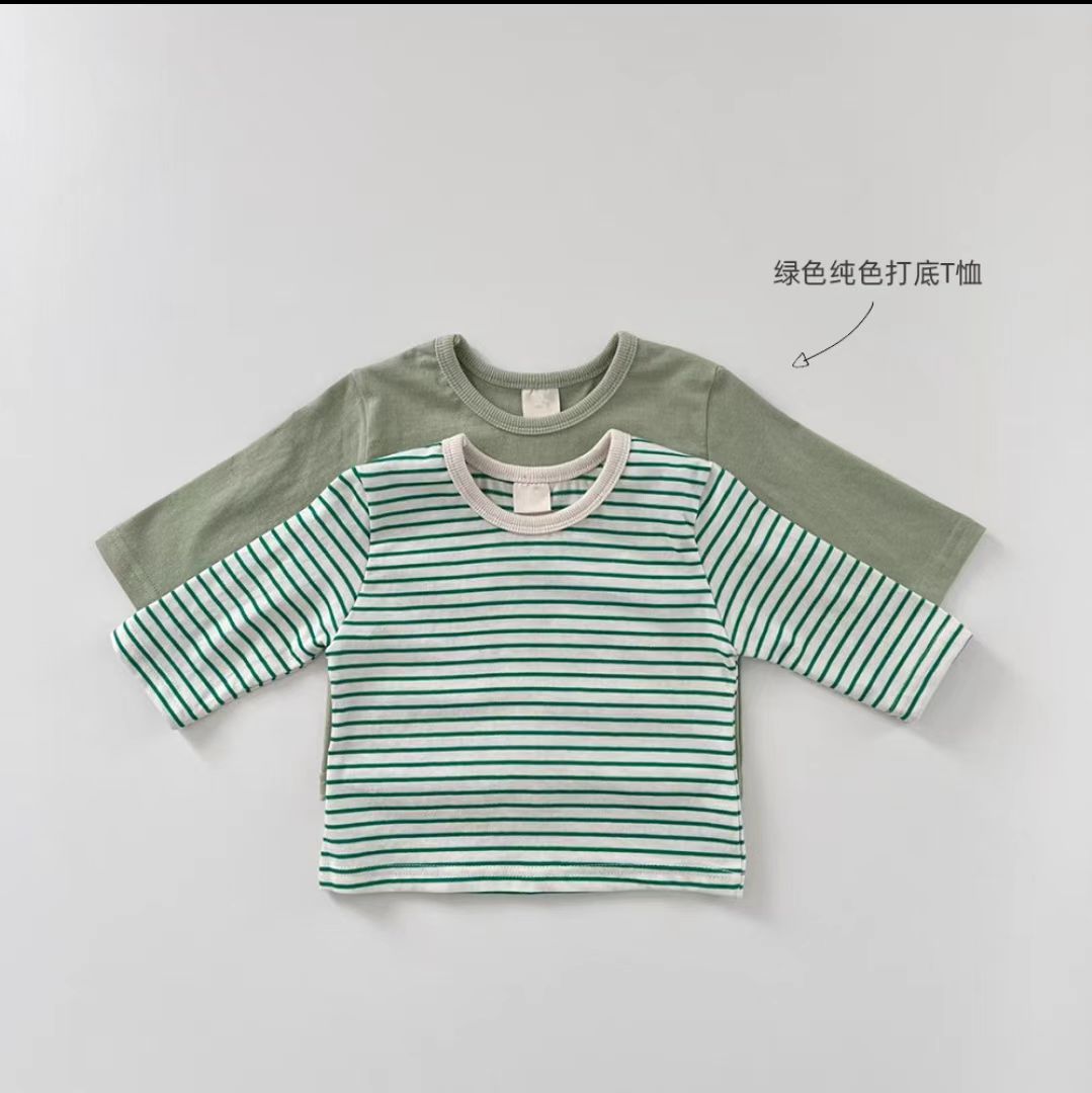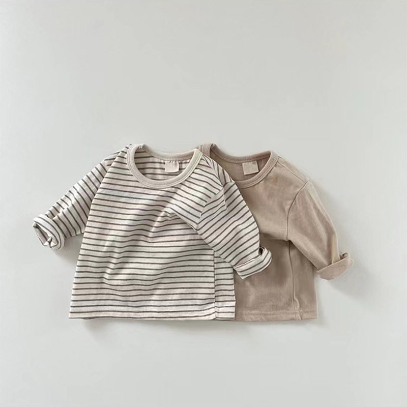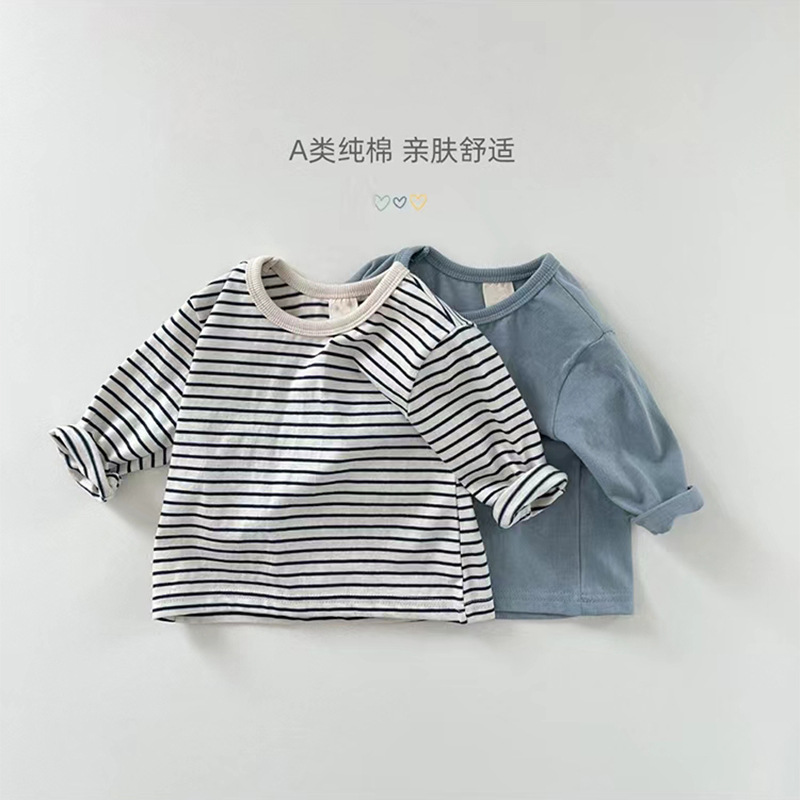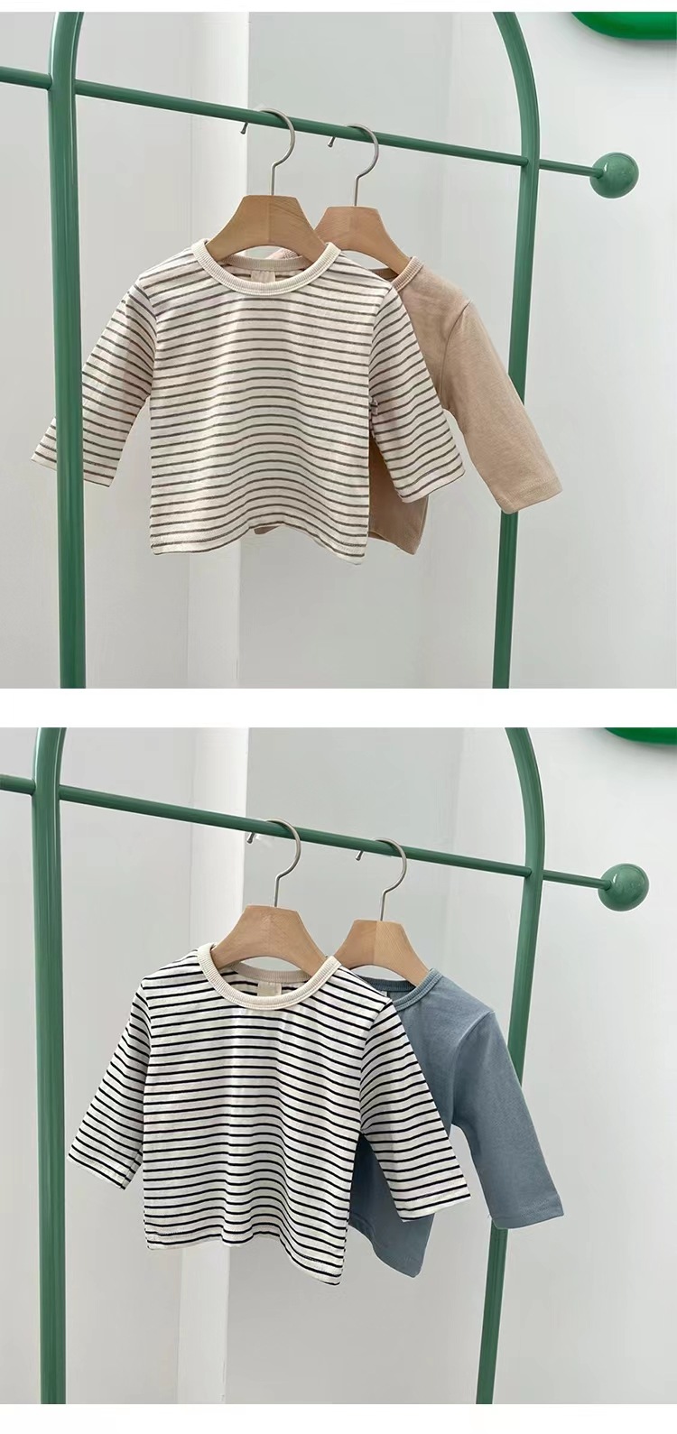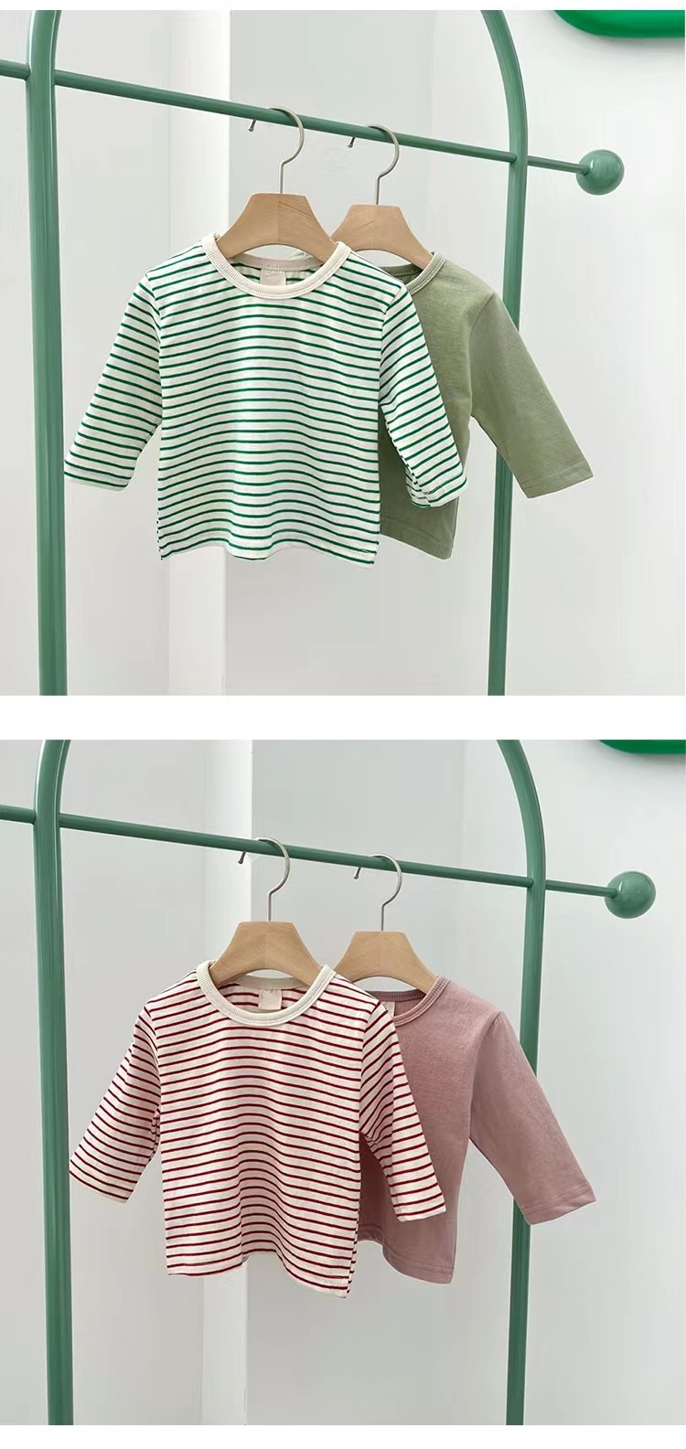 한국 스타일 아동복 스팟 봄, 가을 긴팔 티셔츠 유아, 남성 및 여성 베이비 라운드 넥 솔리드 컬러 스트라이프 바닥 탑스토어 가기