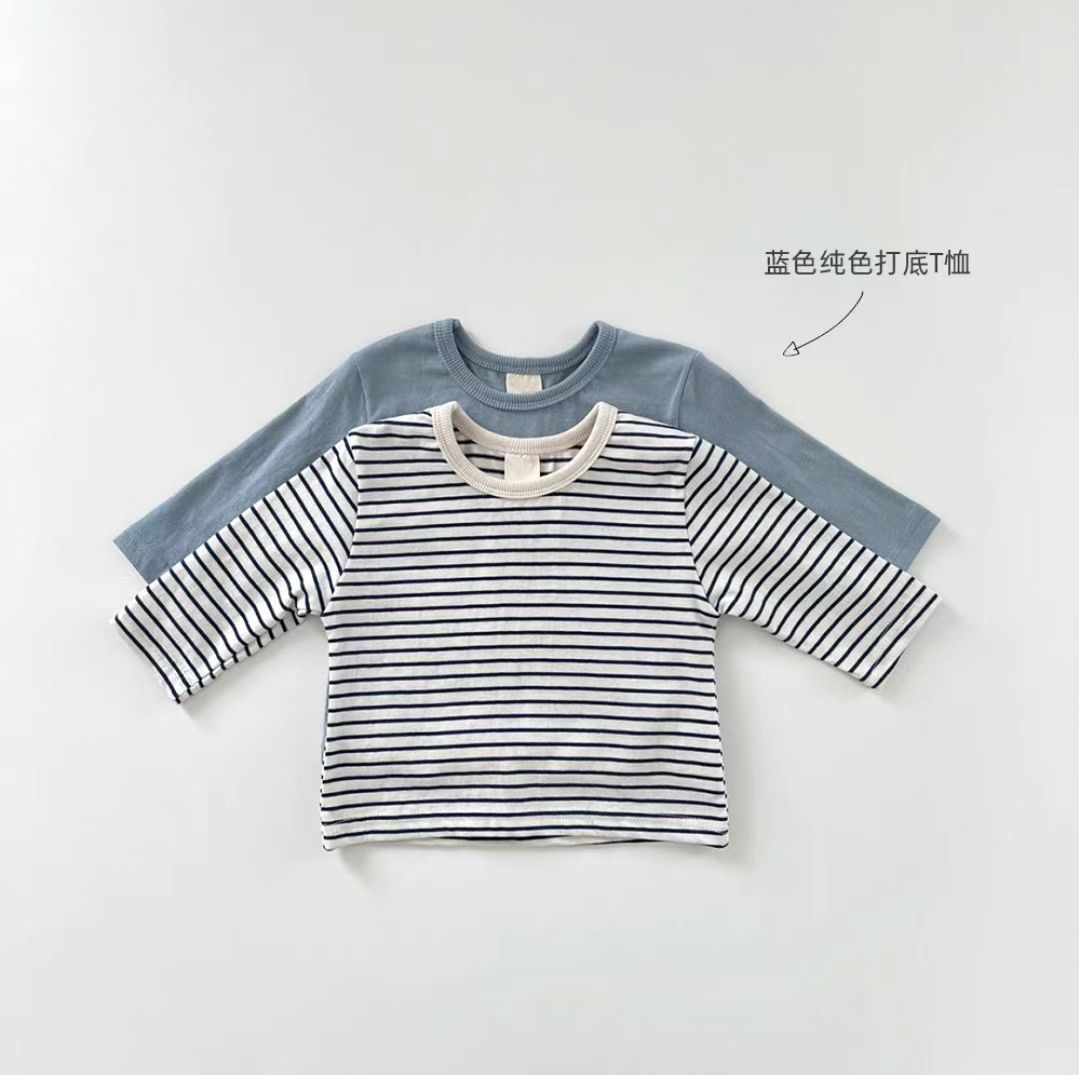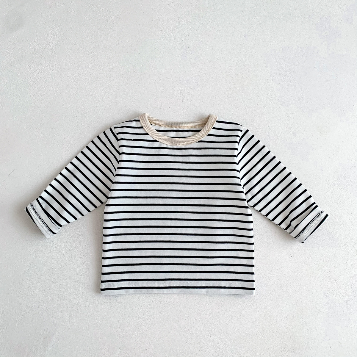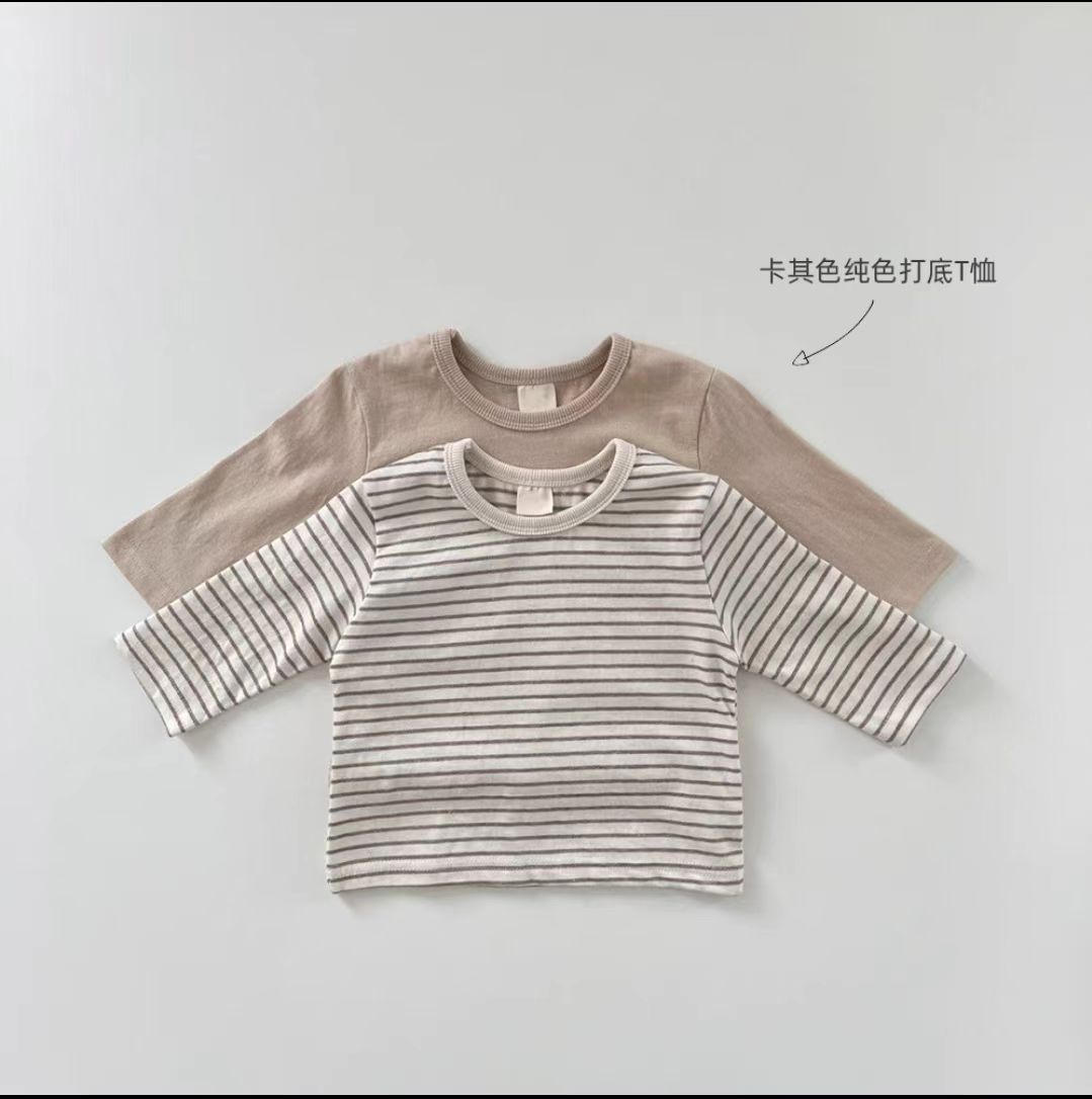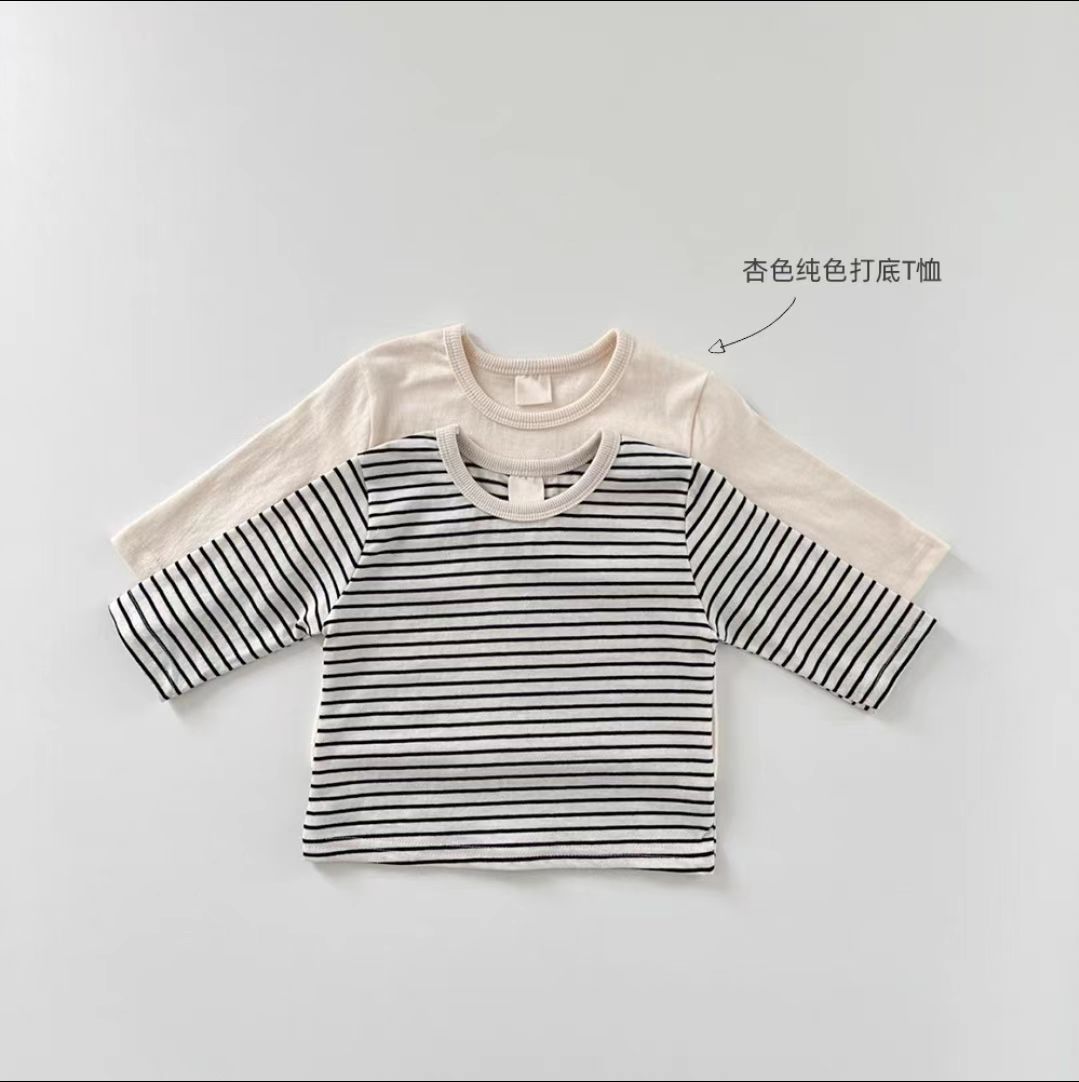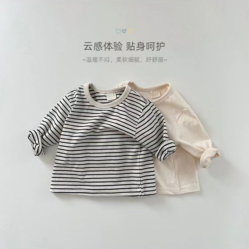 한국 스타일 아동복 스팟 봄, 가을 긴팔 티셔츠 유아, 남성 및 여성 베이비 라운드 넥 솔리드 컬러 스트라이프 바닥 탑스토어 가기