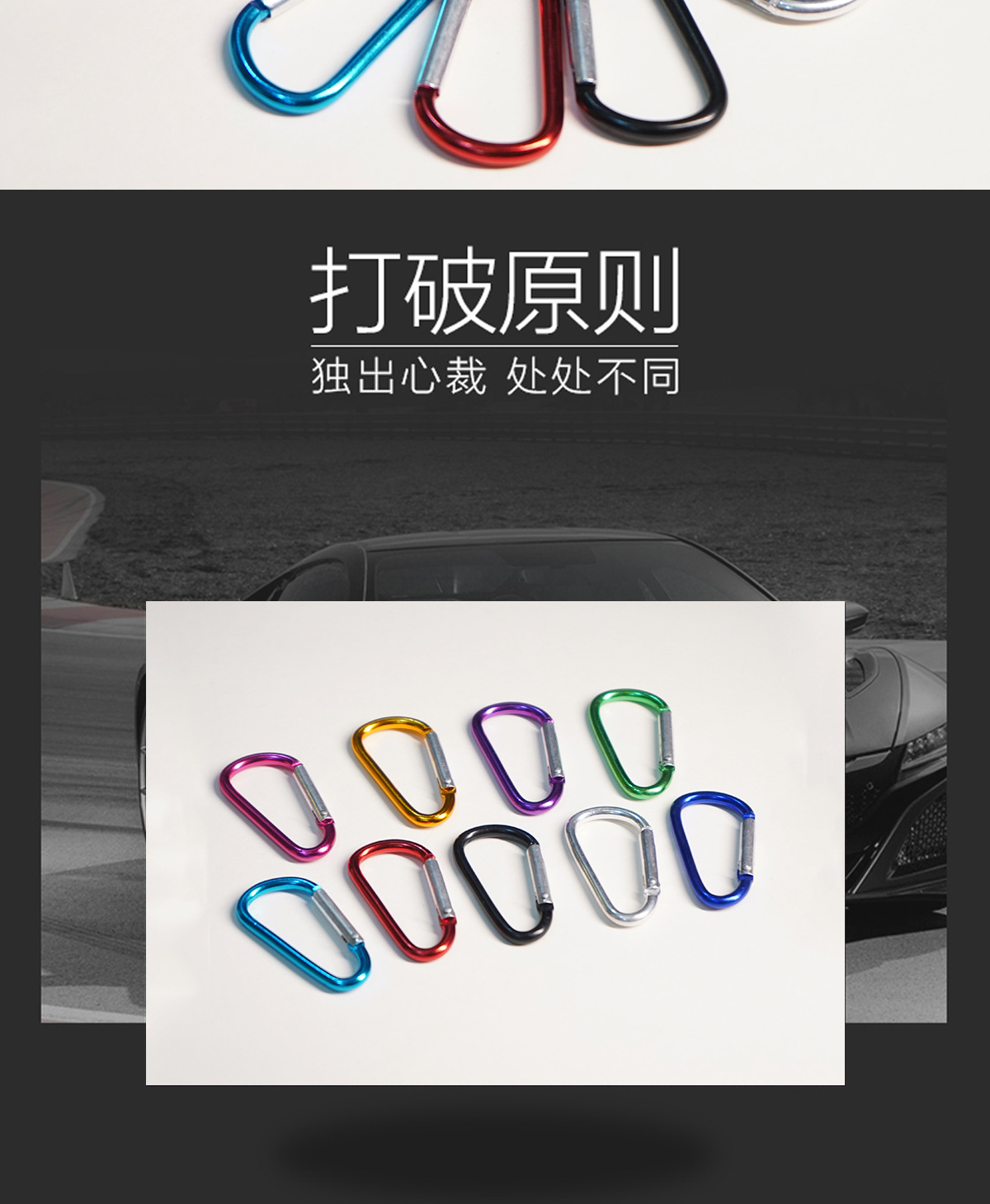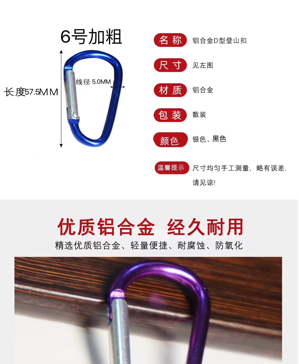 此款登山扣现货颜色只有黑色和银色,其他颜色需要提前预定(6号加粗款登山扣,长度57.5MM,宽度29.5MM,线径5.0MM)