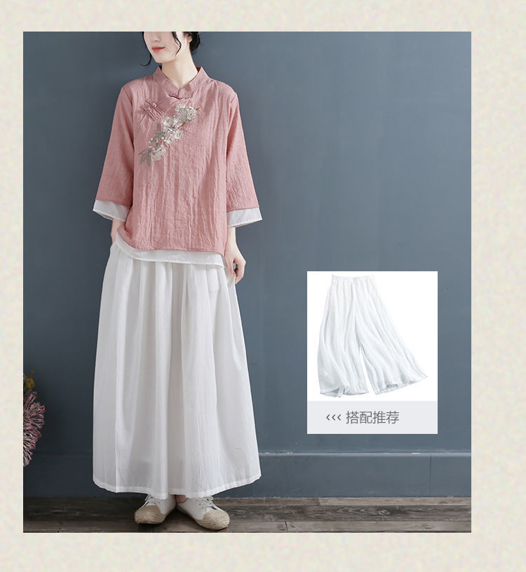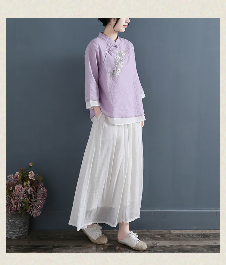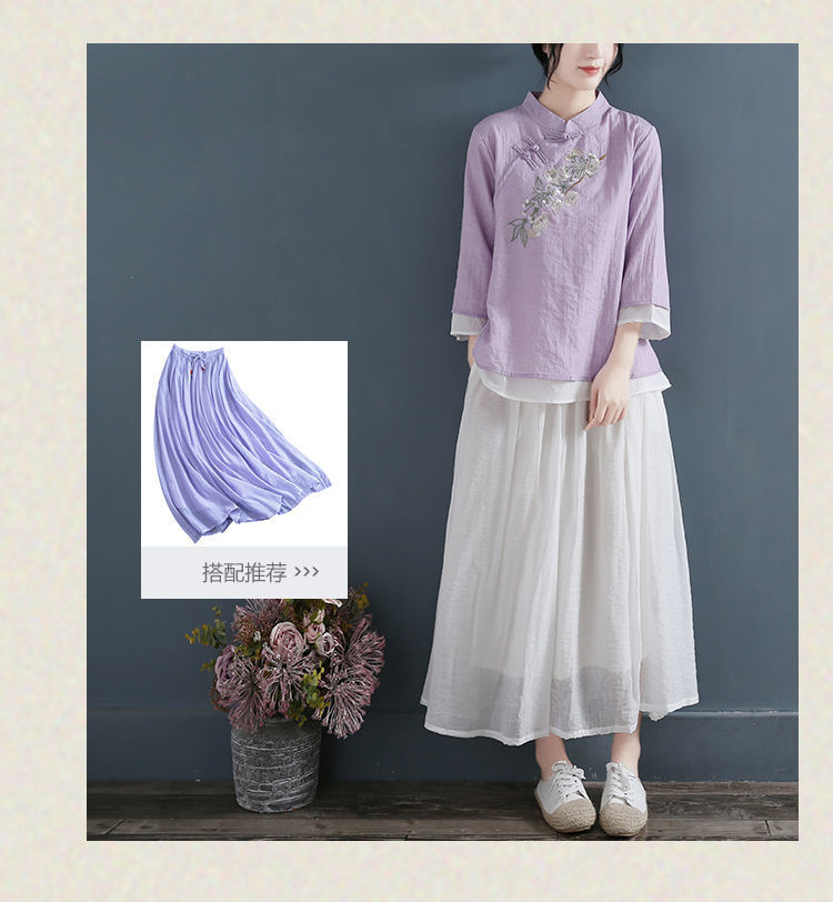 면화와 리넨 자수 셔츠 여성의 2024 년 봄과 가을 새로운 예술적 대형 배꼽 캐주얼 7 점 소매 풀오버 라운드 넥 티셔츠스토어 가기