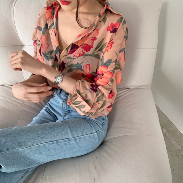 가벼운 럭셔리 꽃 쉬폰 여성의 2021 년 봄과 여름 얇은 슬림 핏 간단한 서양식 긴팔 디자인 셔츠스토어 가기